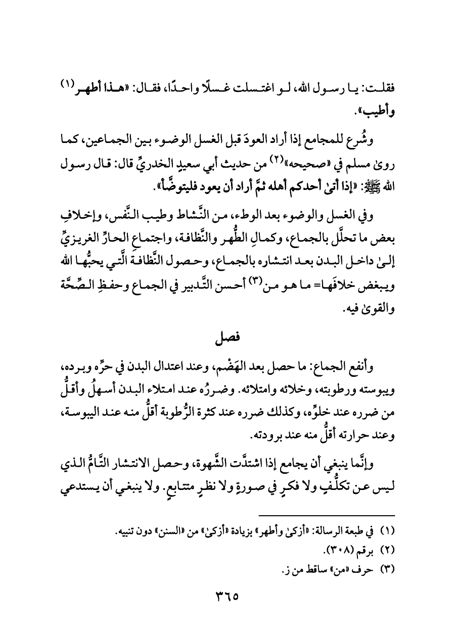 وفي الغسل والوضوء بعد الوطء، من النَّشاط وطيب النَّفس، وإخلافِ بعض ما تحلَّل بالجماع، وكمالِ الطُّهر والنَّظافة، واجتماعِ الحارِّ الغريزيِّ إلى داخل البدن بعد انتشاره بالجماع، وحصول النَّظافة الَّتي يحبُّها اللَّه ويبغض خلافَها= ما هو من (¬٣) أحسن التَّدبير في الجماع وحفظِ الصِّحَّة والقوى فيه.