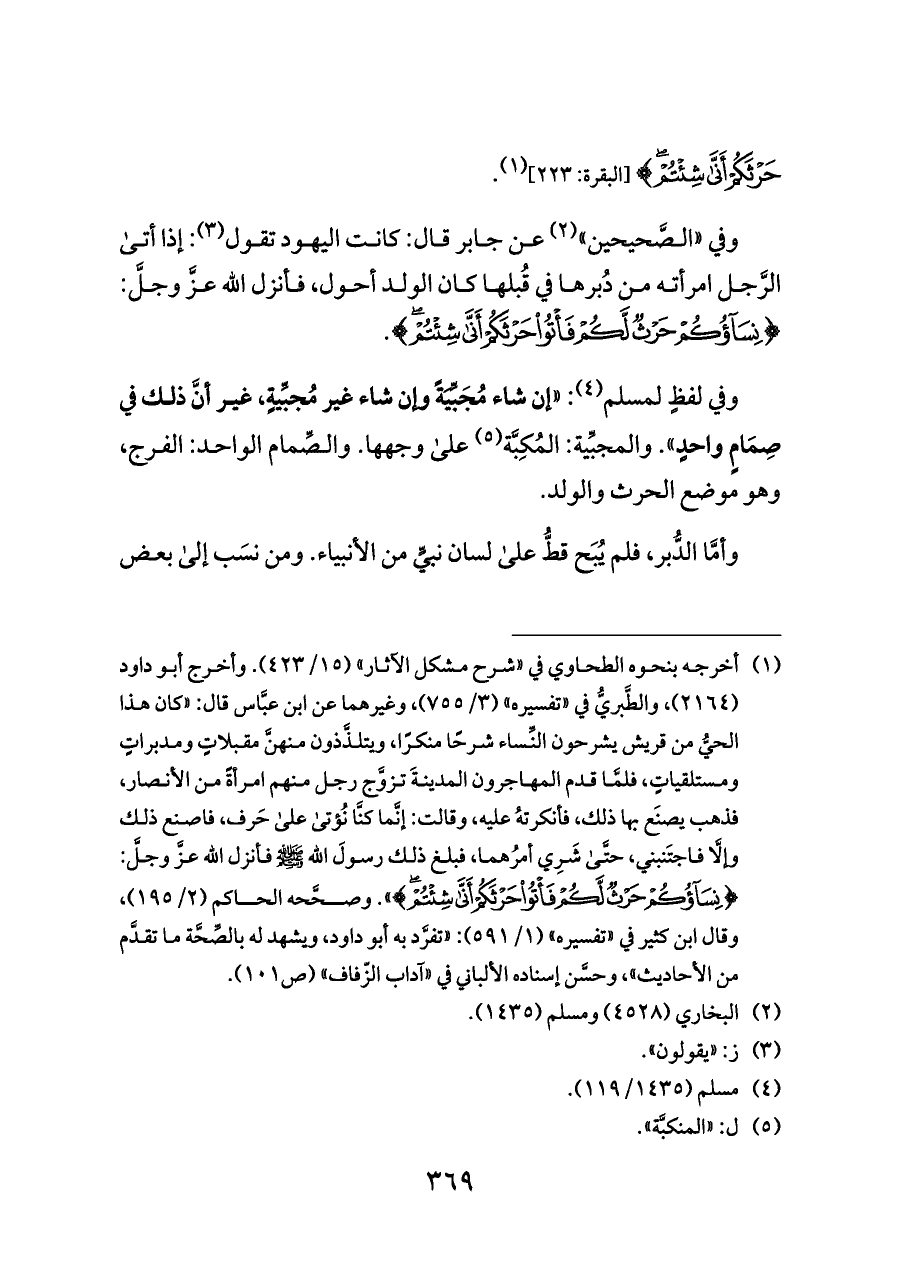 (¬١) أخرجه بنحوه الطحاوي في «شرح مشكل الآثار» (١٥/ ٤٢٣). وأخرج أبو داود (٢١٦٤)، والطَّبريُّ في «تفسيره» (٣/ ٧٥٥)، وغيرهما عن ابن عبَّاس قال: «كان هذا الحيُّ من قريش يشرحون النِّساء شرحًا منكرًا، ويتلذَّذون منهنَّ مقبلاتٍ ومدبراتٍ ومستلقياتٍ، فلمَّا قدم المهاجرون المدينةَ تزوَّج رجل منهم امرأةً من الأنصار، فذهب يصنَع بها ذلك، فأنكرتهُ عليه، وقالت: إنَّما كنَّا نُؤتى على حَرف، فاصنع ذلك وإلَّا فاجتَنبني، حتَّى شَرِي أمرُهما، فبلغ ذلك رسولَ الله - صلى الله عليه وسلم - فأنزل الله عزَّ وجلَّ: {(٢٢٢) نِسَاؤُكُمْ حَرْثٌ لَكُمْ فَأْتُوا حَرْثَكُمْ أَنَّى شِئْتُمْ}». وصحَّحه الحاكم (٢/ ١٩٥)، وقال ابن كثير في «تفسيره» (١/ ٥٩١): «تفرَّد به أبو داود، ويشهد له بالصِّحَّة ما تقدَّم من الأحاديث»، وحسَّن إسناده الألباني في «آداب الزّفاف» (ص ١٠١).