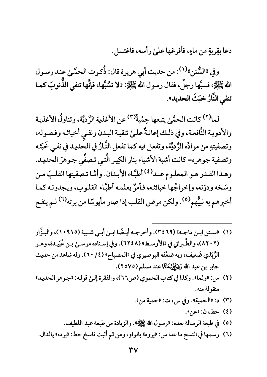 وفي «السُّنن» (¬١): من حديث أبي هريرة قال: ذُكرت الحمَّى عند رسول الله - صلى الله عليه وسلم -، فسبَّها رجلٌ، فقال رسول الله - صلى الله عليه وسلم -: «لا تسُبَّها، فإنَّها تنفي الذُّنوبَ كما تنفي النَّارُ خبَثَ الحديد».