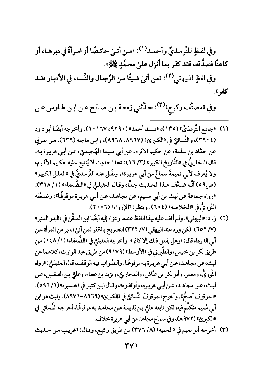 وفي لفظٍ للتِّرمذيِّ وأحمد (¬٣): «من أتى حائضًا أو امرأةً في دبرها، أو كاهنًا فصدَّقه، فقد كفر بما أنزل على محمَّدٍ - صلى الله عليه وسلم -».