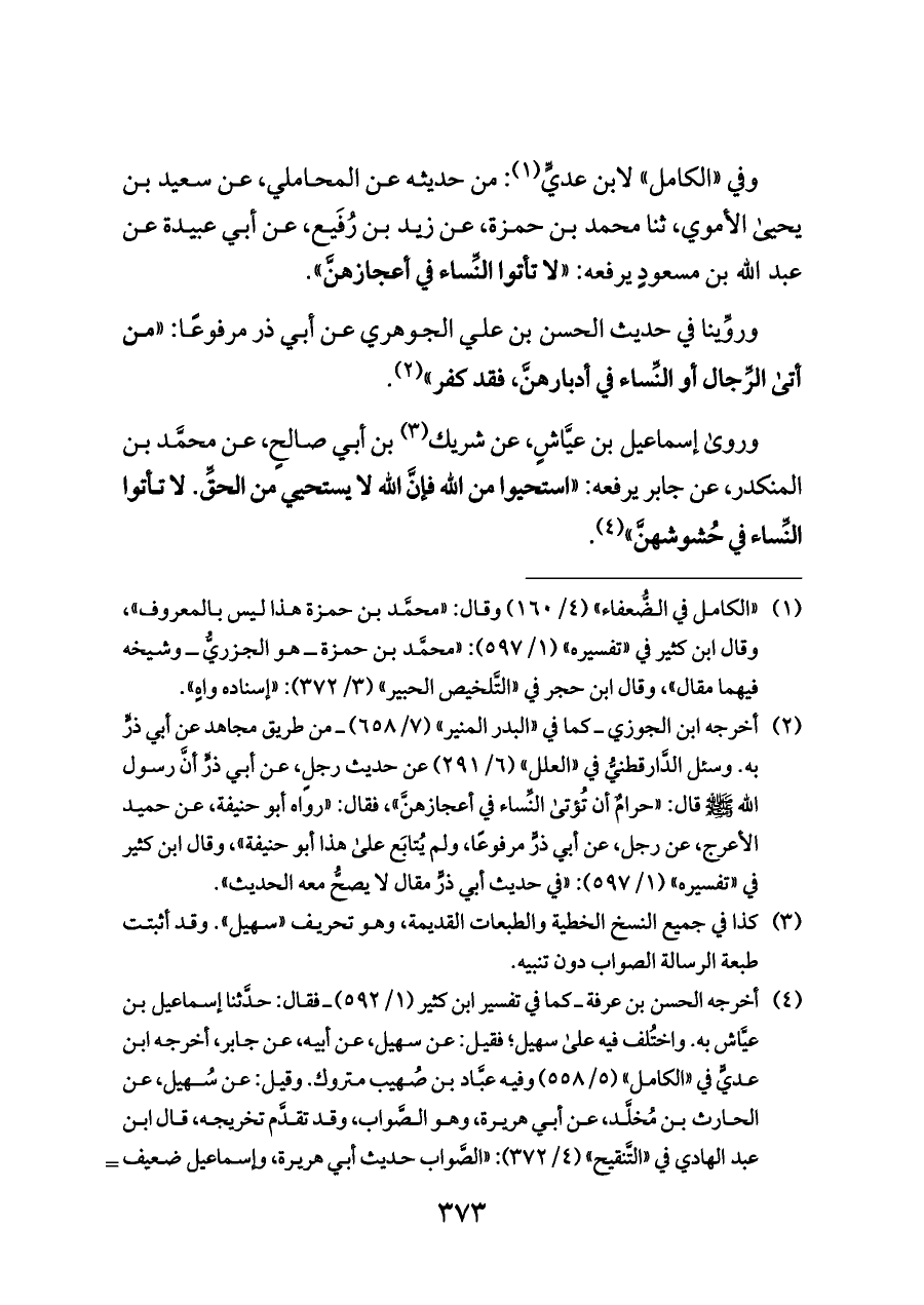 وفي «الكامل» لابن عديٍّ (¬١): من حديثه عن المحاملي، عن سعيد بن يحيى الأموي، ثنا محمد بن حمزة، عن زيد بن رُفَيع، عن أبي عبيدة عن عبد الله بن مسعودٍ يرفعه: «لا تأتوا النِّساء في أعجازهنَّ».