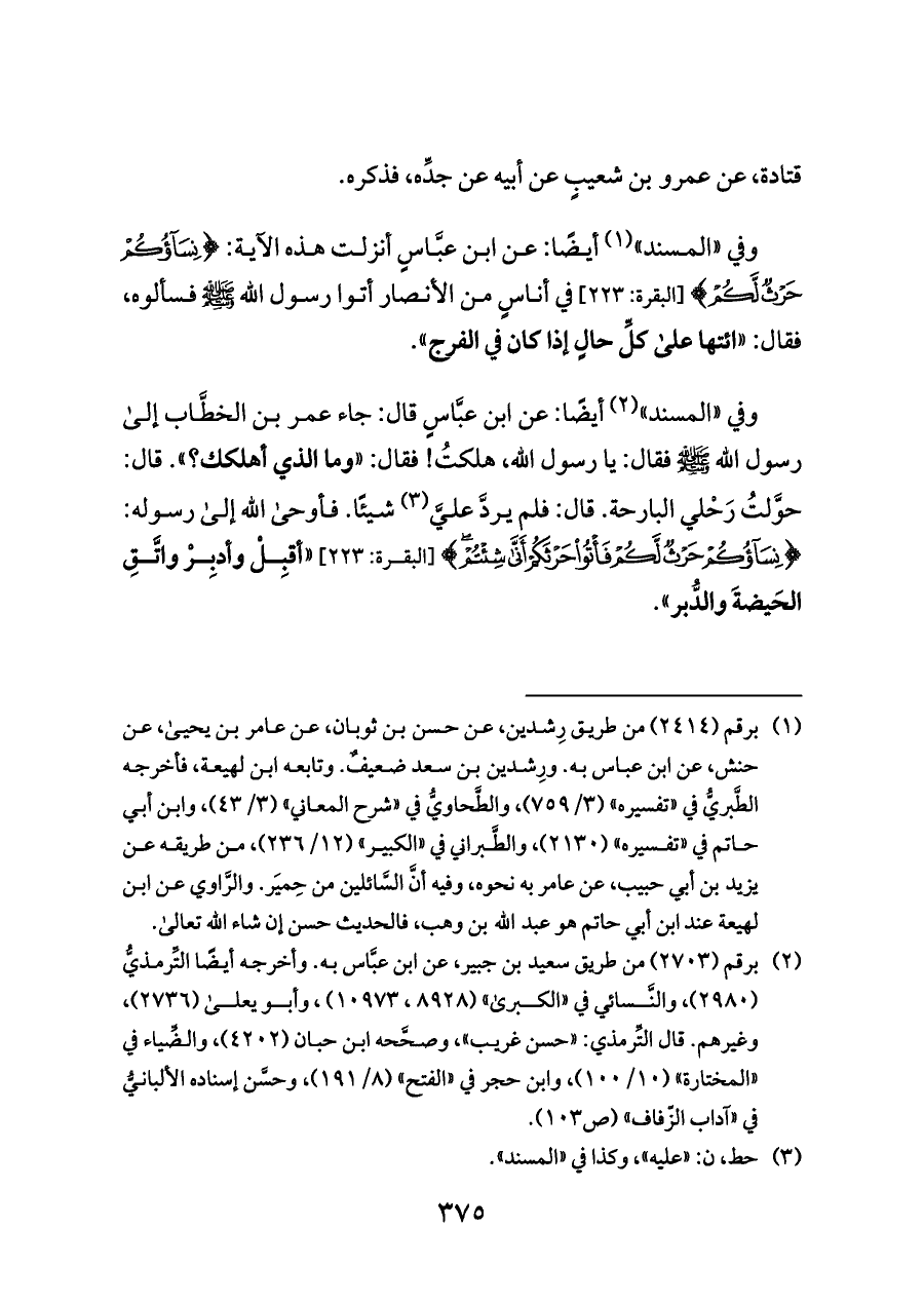 وفي «المسند» (¬٢) أيضًا: عن ابن عبَّاسٍ قال: جاء عمر بن الخطَّاب إلى رسول الله - صلى الله عليه وسلم - فقال: يا رسول اللَّه، هلكتُ! فقال: «وما الذي أهلكك؟». قال: حوَّلتُ رَحْلي البارحة. قال: فلم يردَّ عليَّ (¬٣) شيئًا. فأوحى الله إلى رسوله: {(٢٢٢) نِسَاؤُكُمْ حَرْثٌ لَكُمْ فَأْتُوا حَرْثَكُمْ أَنَّى شِئْتُمْ} [البقرة: ٢٢٣] «أقبِلْ وأدبِرْ واتَّقِ الحَيضةَ والدُّبر».