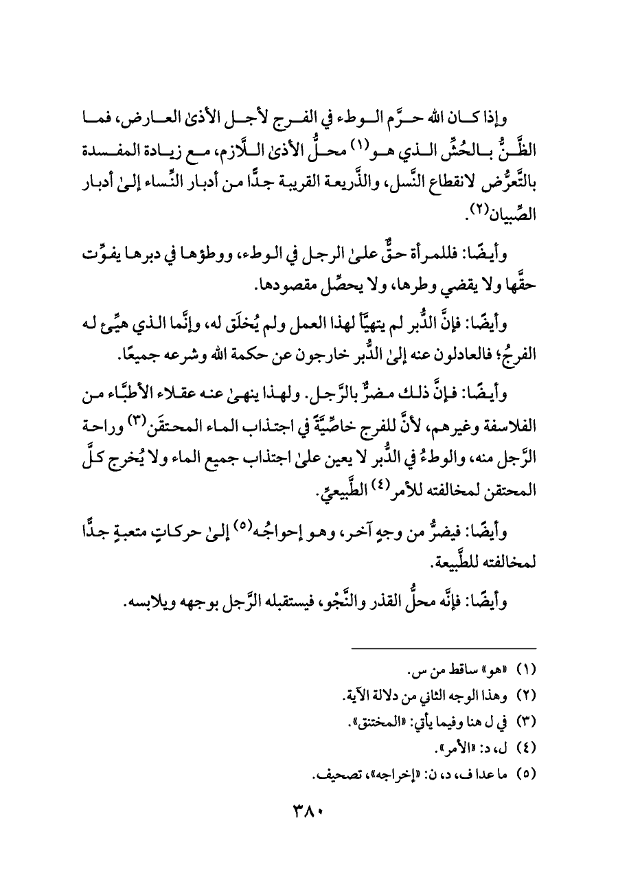 وأيضًا: فإنَّ ذلك مضرٌّ بالرَّجل. ولهذا ينهى عنه عقلاء الأطبَّاء من الفلاسفة وغيرهم، لأنَّ للفرج خاصِّيَّةً في اجتذاب الماء المحتقَن (¬٣) وراحة الرَّجل منه، والوطءُ في الدُّبر لا يعين على اجتذاب جميع الماء ولا يُخرج كلَّ المحتقن لمخالفته للأمر (¬٤) الطَّبيعيِّ.