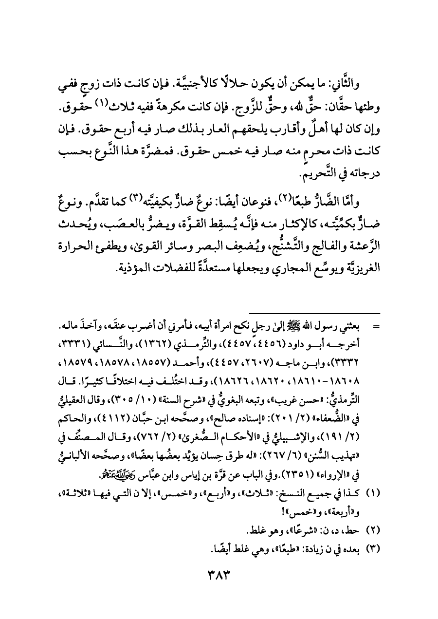 والثَّاني: ما يمكن أن يكون حلالًا كالأجنبيَّة. فإن كانت ذات زوجٍ ففي وطئها حقَّان: حقٌّ للَّه، وحقٌّ للزَّوج. فإن كانت مكرهةً ففيه ثلاث (¬١) حقوق. وإن كان لها أهلٌ وأقارب يلحقهم العار بذلك صار فيه أربع حقوق. فإن كانت ذات محرمٍ منه صار فيه خمس حقوق. فمضرَّة هذا النَّوع بحسب درجاته في التَّحريم.