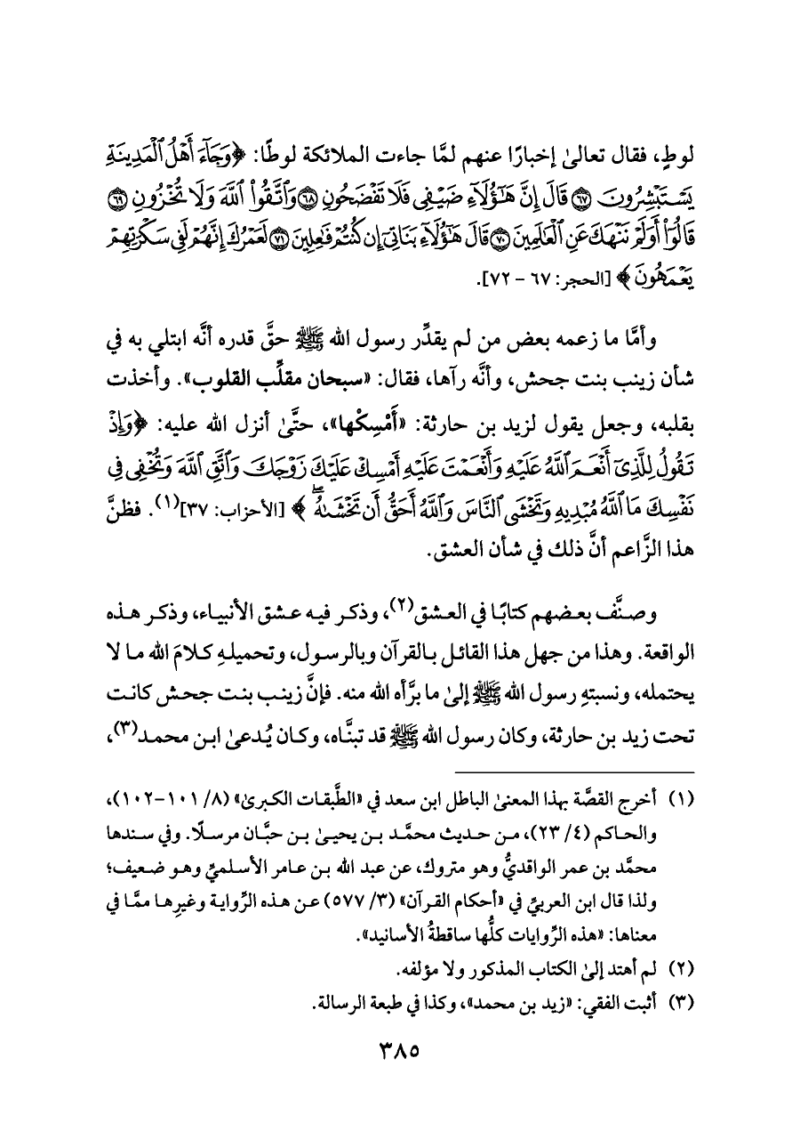 وأمَّا ما زعمه بعض من لم يقدِّر رسول الله - صلى الله عليه وسلم - حقَّ قدره أنَّه ابتلي به في شأن زينب بنت جحش، وأنَّه رآها، فقال: «سبحان مقلِّب القلوب». وأخذت بقلبه، وجعل يقول لزيد بن حارثة: «أَمْسِكْها»، حتَّى أنزل الله عليه: {وَإِذْ تَقُولُ لِلَّذِي أَنْعَمَ اللَّهُ عَلَيْهِ وَأَنْعَمْتَ عَلَيْهِ أَمْسِكْ عَلَيْكَ زَوْجَكَ وَاتَّقِ اللَّهَ وَتُخْفِي فِي نَفْسِكَ مَا اللَّهُ مُبْدِيهِ وَتَخْشَى النَّاسَ وَاللَّهُ أَحَقُّ أَنْ تَخْشَاهُ} [الأحزاب: ٣٧] (¬١). فظنَّ هذا الزَّاعم أنَّ ذلك في شأن العشق.
