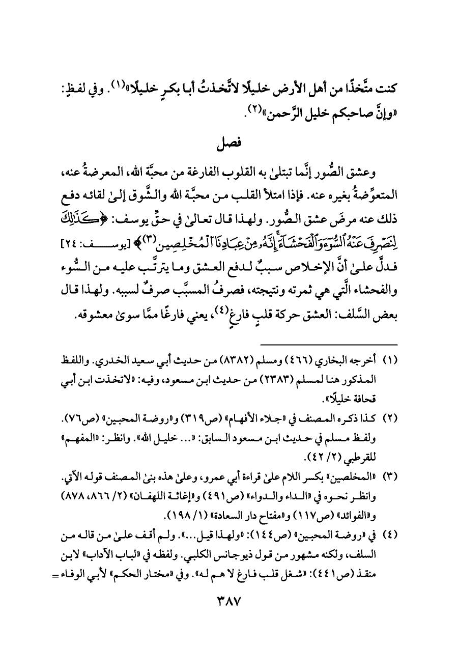 وعشق الصُّور إنَّما تبتلى به القلوب الفارغة من محبَّة الله، المعرضةُ عنه، المتعوِّضةُ بغيره عنه. فإذا امتلأ القلب من محبَّة الله والشَّوق إلى لقائه دفع ذلك عنه مرضَ عشق الصُّور. ولهذا قال تعالى في حقِّ يوسف: {كَذَلِكَ لِنَصْرِفَ عَنْهُ السُّوءَ وَالْفَحْشَاءَ إِنَّهُ مِنْ عِبَادِنَا الْمُخَلِصِينِ (¬٣)} [يوسف: ٢٤] فدلَّ على أنَّ الإخلاص سببٌ لدفع العشق وما يترتَّب عليه من السُّوء والفحشاء الَّتي هي ثمرته ونتيجته، فصرفُ المسبَّب صرفٌ لسببه. ولهذا قال بعض السَّلف: العشق حركة قلبٍ فارغٍ (¬٤)، يعني فارغًا ممَّا سوى معشوقه.