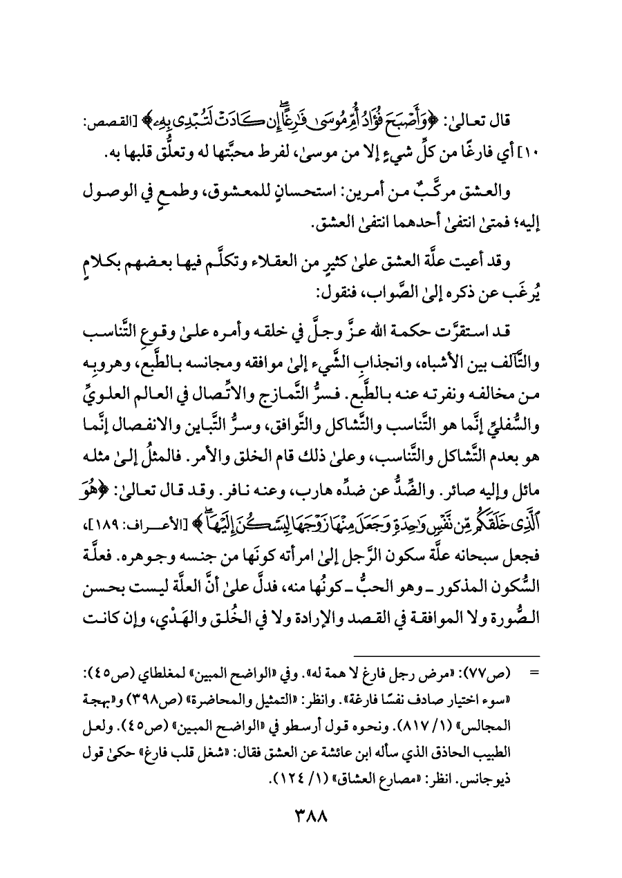 قد استقرَّت حكمة الله عزَّ وجلَّ في خلقه وأمره على وقوعِ التَّناسب والتَّآلف بين الأشباه، وانجذابِ الشَّيء إلى موافقه ومجانسه بالطَّبع، وهروبِه من مخالفه ونفرته عنه بالطَّبع. فسرُّ التَّمازج والاتِّصال في العالم العلويِّ والسُّفليِّ إنَّما هو التَّناسب والتَّشاكل والتَّوافق، وسرُّ التَّباين والانفصال إنَّما هو بعدم التَّشاكل والتَّناسب، وعلى ذلك قام الخلق والأمر. فالمثلُ إلى مثله مائل وإليه صائر. والضِّدُّ عن ضدِّه هارب، وعنه نافر. وقد قال تعالى: {هُوَ الَّذِي خَلَقَكُمْ مِنْ نَفْسٍ وَاحِدَةٍ وَجَعَلَ مِنْهَا زَوْجَهَا لِيَسْكُنَ إِلَيْهَا} [الأعراف: ١٨٩]، فجعل سبحانه علَّة سكون الرَّجل إلى امرأته كونَها من جنسه وجوهره. فعلَّة السُّكون المذكور ــ وهو الحبُّ ــ كونُها منه، فدلَّ على أنَّ العلَّة ليست بحسن الصُّورة ولا الموافقة في القصد والإرادة ولا في الخُلق والهَدْي، وإن كانت
