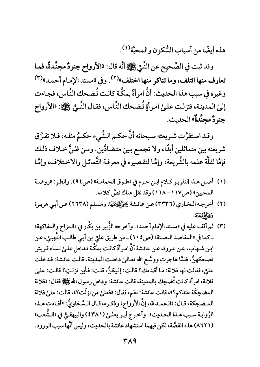 وقد ثبت في الصَّحيح عن النَّبيِّ - صلى الله عليه وسلم - أنَّه قال: «الأرواح جنودٌ مجنَّدةٌ، فما تعارف منها ائتلف، وما تناكر منها اختلف» (¬٢). وفي «مسند الإمام أحمد» (¬٣) وغيره في سبب هذا الحديث: أنَّ امرأةً بمكَّة كانت تُضحك النَّاس، فجاءت إلى المدينة، فنزلت على امرأةٍ تُضحك النَّاس، فقال النَّبيُّ - صلى الله عليه وسلم -: «الأرواح جنودٌ مجنَّدةٌ» الحديث.