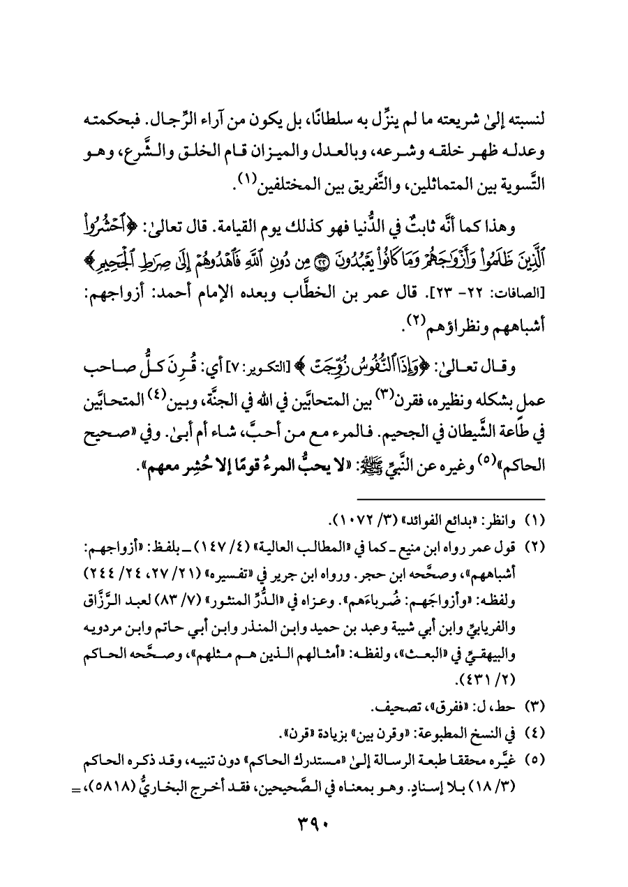 وهذا كما أنَّه ثابتٌ في الدُّنيا فهو كذلك يوم القيامة. قال تعالى: {احْشُرُوا الَّذِينَ ظَلَمُوا وَأَزْوَاجَهُمْ وَمَا كَانُوا يَعْبُدُونَ (٢٢) مِنْ دُونِ اللَّهِ فَاهْدُوهُمْ إِلَى صِرَاطِ الْجَحِيمِ} [الصافات: ٢٢ - ٢٣]. قال عمر بن الخطَّاب وبعده الإمام أحمد: أزواجهم: أشباههم ونظراؤهم (¬٢).