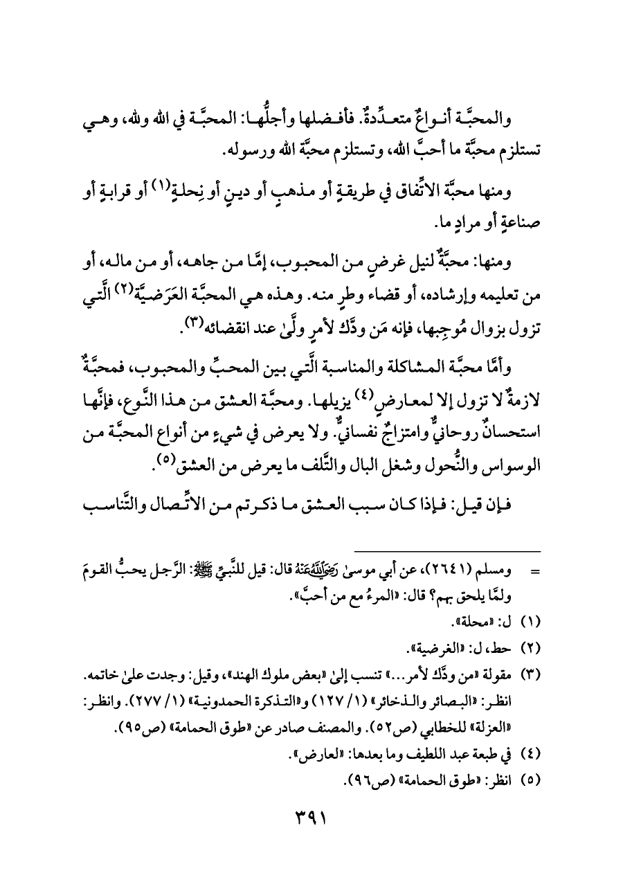 وأمَّا محبَّة المشاكلة والمناسبة الَّتي بين المحبِّ والمحبوب، فمحبَّةٌ لازمةٌ لا تزول إلا لمعارضٍ (¬٤) يزيلها. ومحبَّة العشق من هذا النَّوع، فإنَّها استحسانٌ روحانيٌّ وامتزاجٌ نفسانيٌّ. ولا يعرض في شيءٍ من أنواع المحبَّة من الوسواس والنُّحول وشغل البال والتَّلف ما يعرض من العشق (¬٥).