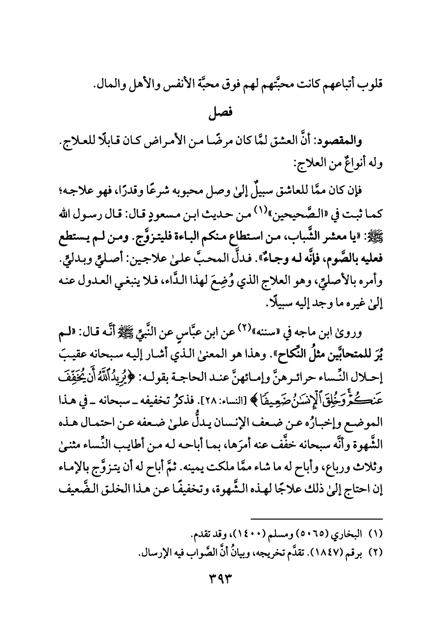 فإن كان ممَّا للعاشق سبيلٌ إلى وصل محبوبه شرعًا وقدرًا، فهو علاجه؛ كما ثبت في «الصَّحيحين» (¬١) من حديث ابن مسعودٍ قال: قال رسول الله - صلى الله عليه وسلم -: «يا معشر الشَّباب، من استطاع منكم الباءة فليتزوَّج. ومن لم يستطع فعليه بالصَّوم، فإنَّه له وجاءٌ». فدلَّ المحبَّ على علاجين: أصليٍّ وبدليٍّ. وأمره بالأصليِّ، وهو العلاج الذي وُضِعَ لهذا الدَّاء، فلا ينبغي العدول عنه إلى غيره ما وجد إليه سبيلًا.