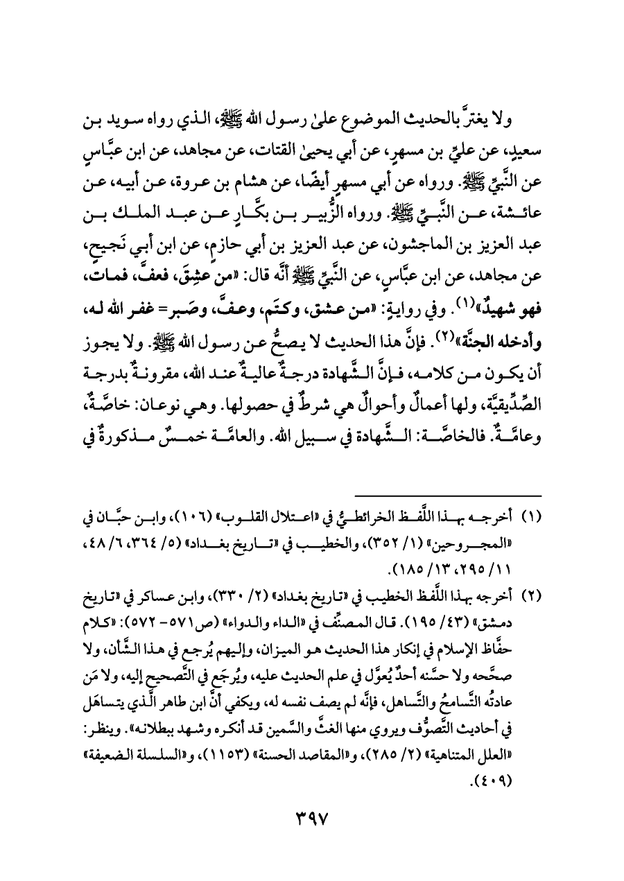ولا يغترَّ بالحديث الموضوع على رسول الله - صلى الله عليه وسلم -، الذي رواه سويد بن سعيدٍ، عن عليِّ بن مسهرٍ، عن أبي يحيى القتات، عن مجاهد، عن ابن عبَّاسٍ عن النَّبيِّ - صلى الله عليه وسلم -. ورواه عن أبي مسهرٍ أيضًا، عن هشام بن عروة، عن أبيه، عن عائشة، عن النَّبيِّ - صلى الله عليه وسلم -. ورواه الزُّبير بن بكَّارٍ عن عبد الملك بن عبد العزيز بن الماجشون، عن عبد العزيز بن أبي حازمٍ، عن ابن أبي نَجيحٍ، عن مجاهد، عن ابن عبَّاسٍ، عن النَّبيِّ - صلى الله عليه وسلم - أنَّه قال: «من عشِقَ، فعفَّ، فمات، فهو شهيدٌ» (¬١). وفي روايةٍ: «من عشق، وكتَم، وعفَّ، وصَبر= غفر الله له، وأدخله الجنَّة» (¬٢). فإنَّ هذا الحديث لا يصحُّ عن رسول الله - صلى الله عليه وسلم -. ولا يجوز أن يكون من كلامه، فإنَّ الشَّهادة درجةٌ عاليةٌ عند اللَّه، مقرونةٌ بدرجة الصِّدِّيقيَّة، ولها أعمالٌ وأحوالٌ هي شرطٌ في حصولها. وهي نوعان: خاصَّةٌ، وعامَّةٌ. فالخاصَّة: الشَّهادة في سبيل اللَّه.