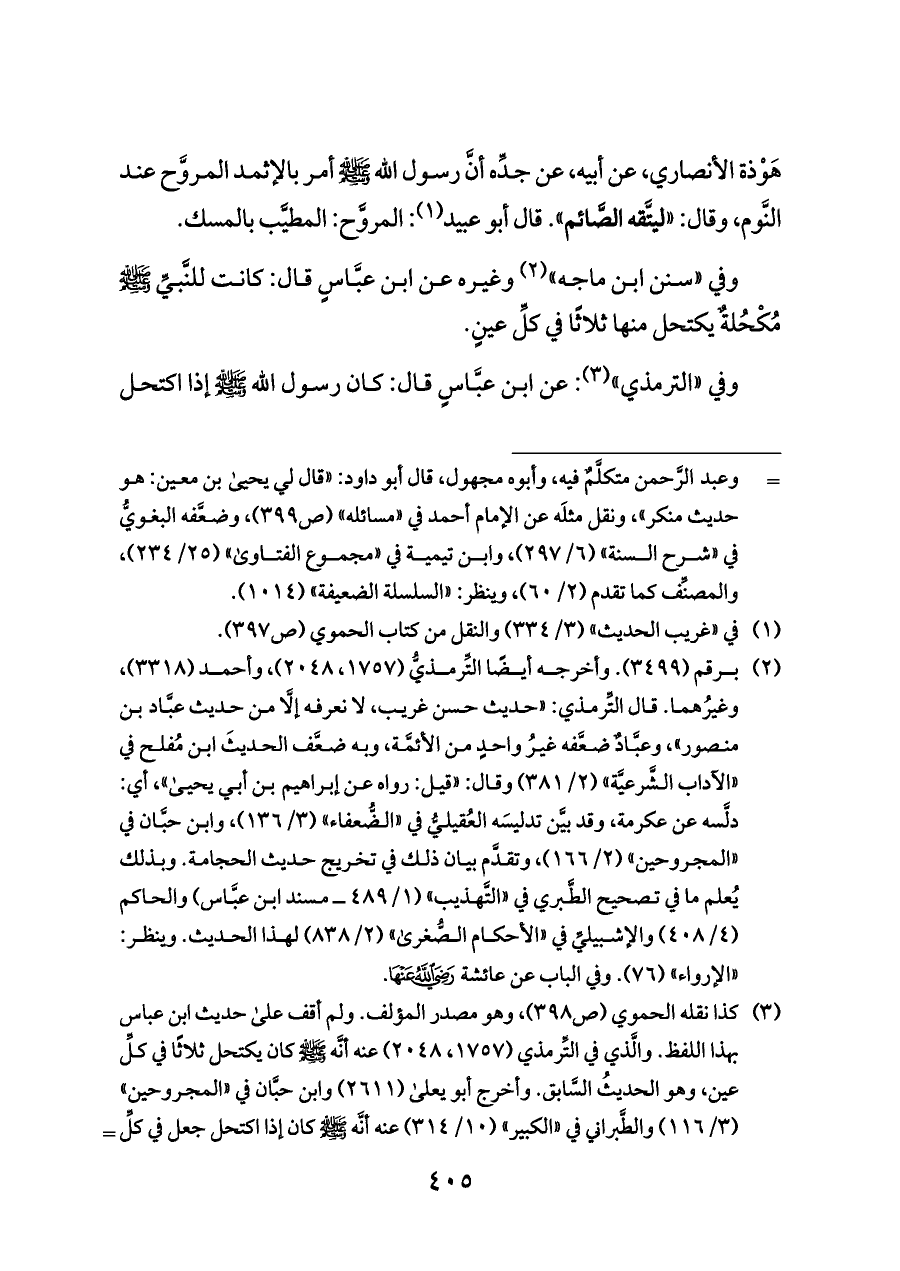 (¬٣) كذا نقله الحموي (ص ٣٩٨)، وهو مصدر المؤلف. ولم أقف على حديث ابن عباس بهذا اللفظ. والَّذي في التِّرمذي (١٧٥٧، ٢٠٤٨) عنه أنَّه - صلى الله عليه وسلم - كان يكتحل ثلاثًا في كلِّ عين، وهو الحديثُ السَّابق. وأخرج أبو يعلى (٢٦١١) وابن حبَّان في «المجروحين» (٣/ ١١٦) والطَّبراني في «الكبير» (١٠/ ٣١٤) عنه أنَّه - صلى الله عليه وسلم - كان إذا اكتحل جعل في كلِّ عين اثنَين وواحدًا بينهما، وإسناده هالك؛ فيه عمرو بن الحصين عن يحيى بن العلاء وهما متروكان. وأمَّا اكتحالُه - صلى الله عليه وسلم - في اليمنَى ثلاثًا وفي اليسرى مرَّتين، فرواه ابن أبي شيبة (٢٣٤٨٧) عن عمران بن أبي أنس مرسلًا، ورواه أبو الشَّيخ في «أخلاق النَّبي» (٥٢٦)، ومن طريقه البغويُّ في «شرح السنة» (١٢/ ١١٩)، عن عمران بن أبي أنس عن أنس - رضي الله عنه - موصولًا، وقد صححه الألباني في «السلسلة الصَّحيحَة» (٦٣٣). وله شاهد عند الطَّبراني في «الكبير» (١٢/ ٣٦٤) وفي «الأوسط» (٨٧٧)، ومن طريقه البيهقيُّ في «الشُّعب» (٦٠١١)، من حديث ابن عمر - رضي الله عنهما -، وإسناده ليِّن كما قال العراقيُّ في «المغني» (٣/ ١٣١٠).