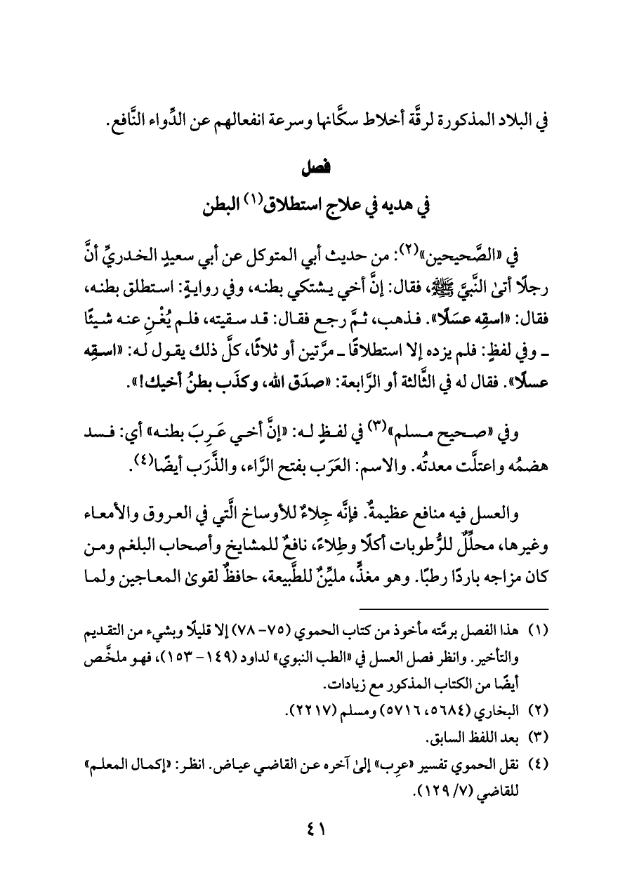 (¬١) هذا الفصل برمَّته مأخوذ من كتاب الحموي (٧٥ - ٧٨) إلا قليلًا وبشيء من التقديم والتأخير. وانظر فصل العسل في «الطب النبوي» لداود (١٤٩ - ١٥٣)، فهو ملخَّص أيضًا من الكتاب المذكور مع زيادات.