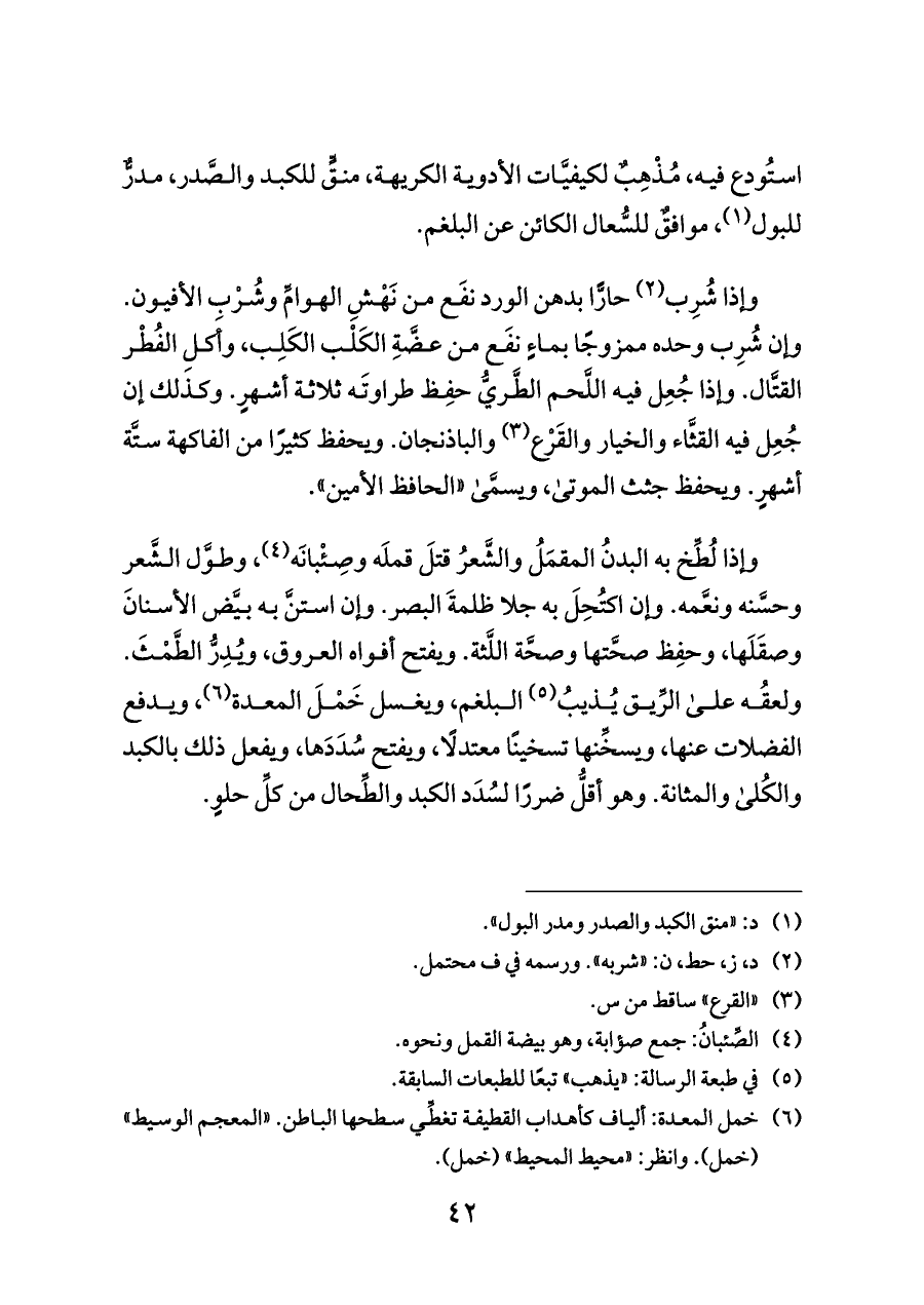 وإذا شُرِب (¬٢) حارًّا بدهن الورد نفَع من نَهْشِ الهوامِّ وشُرْبِ الأفيون. وإن شُرِب وحده ممزوجًا بماءٍ نفَع من عضَّةِ الكَلْب الكَلِب، وأكلِ الفُطْر القتَّال. وإذا جُعِل فيه اللَّحم الطَّريُّ حفِظ طراوتَه ثلاثة أشهرٍ. وكذلك إن جُعِل فيه القثَّاء والخيار والقَرْع (¬٣) والباذنجان. ويحفظ كثيرًا من الفاكهة ستَّة أشهرٍ. ويحفظ جثث الموتى، ويسمَّى «الحافظ الأمين».