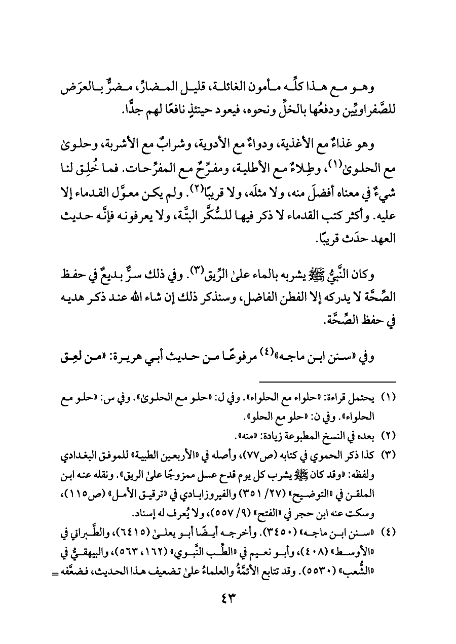 (¬٣) كذا ذكر الحموي في كتابه (ص ٧٧)، وأصله في «الأربعين الطبية» للموفق البغدادي ولفظه: «وقد كان - صلى الله عليه وسلم - يشرب كل يوم قدح عسل ممزوجًا على الريق». ونقله عنه ابن الملقن في «التوضيح» (٢٧/ ٣٥١) والفيروزابادي في «ترقيق الأمل» (ص ١١٥)، وسكت عنه ابن حجر في «الفتح» (٩/ ٥٥٧)، ولا يُعرف له إسناد.