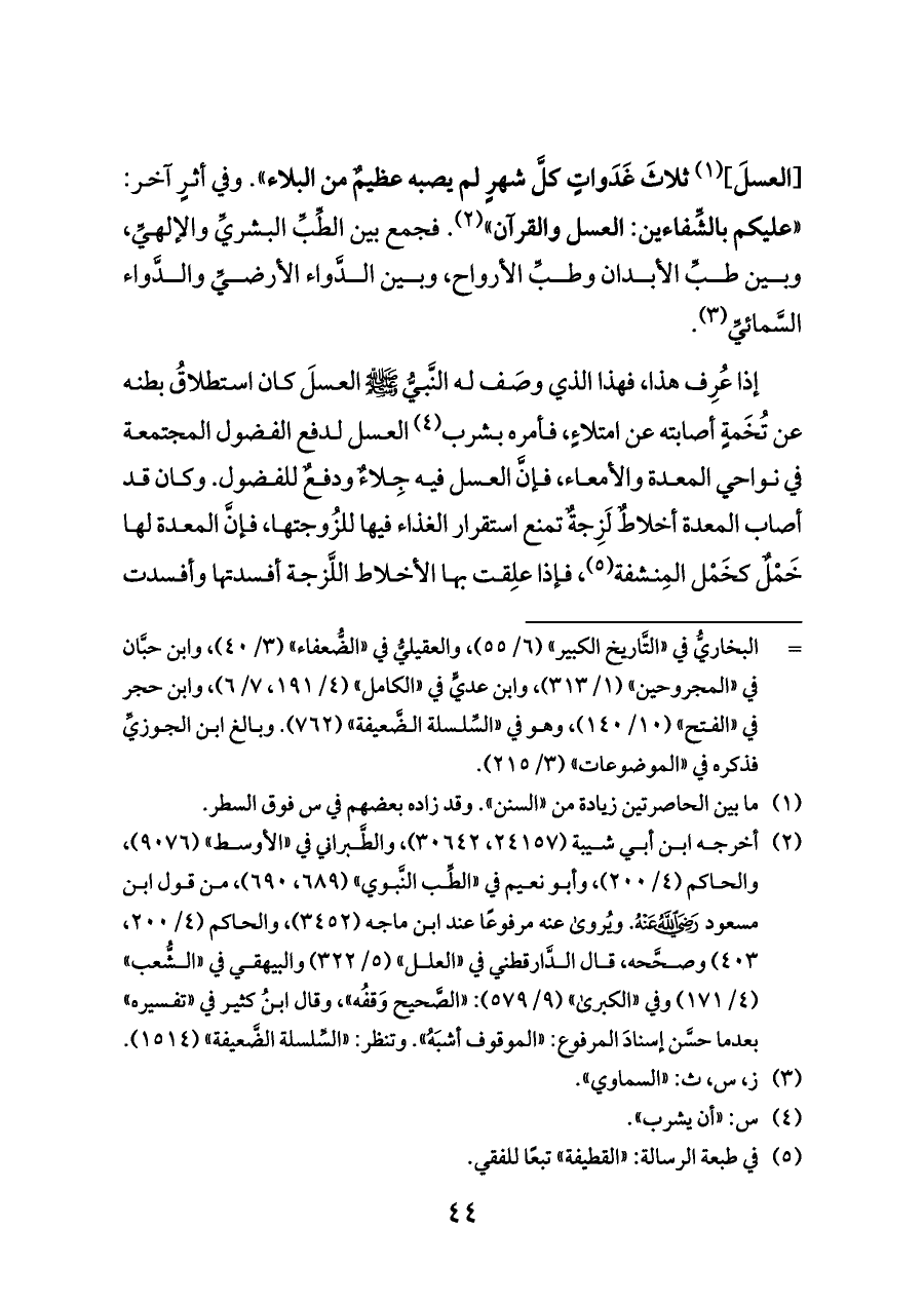 [العسلَ] (¬١) ثلاثَ غَدَواتٍ كلَّ شهرٍ لم يصبه عظيمٌ من البلاء». وفي أثرٍ آخر: «عليكم بالشِّفاءين: العسل والقرآن» (¬٢). فجمع بين الطِّبِّ البشريِّ والإلهيِّ، وبين طبِّ الأبدان وطبِّ الأرواح، وبين الدَّواء الأرضيِّ والدَّواء السَّمائيِّ (¬٣).