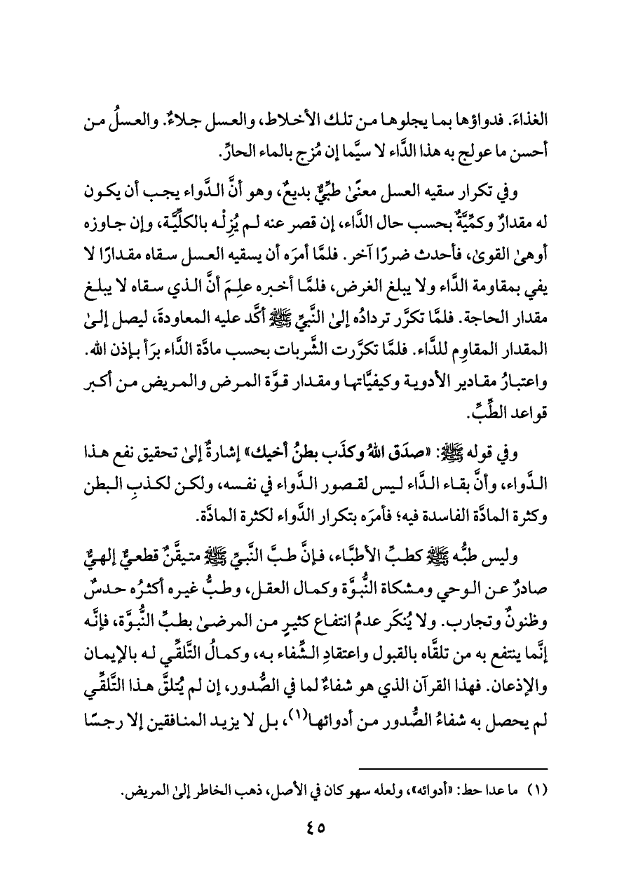 وليس طبُّه - صلى الله عليه وسلم - كطبِّ الأطبَّاء، فإنَّ طبَّ النَّبيِّ - صلى الله عليه وسلم - متيقَّنٌ قطعيٌّ إلهيٌّ صادرٌ عن الوحي ومشكاة النُّبوَّة وكمال العقل، وطبُّ غيره أكثرُه حدسٌ وظنونٌ وتجارب. ولا يُنكَر عدمُ انتفاع كثيرٍ من المرضى بطبِّ النُّبوَّة، فإنَّه إنَّما ينتفع به من تلقَّاه بالقبول واعتقادِ الشِّفاء به، وكمالُ التَّلقِّي له بالإيمان والإذعان. فهذا القرآن الذي هو شفاءٌ لما في الصُّدور، إن لم يُتلقَّ هذا التَّلقِّي لم يحصل به شفاءُ الصُّدور من أدوائها (¬١)، بل لا يزيد المنافقين إلا رجسًا