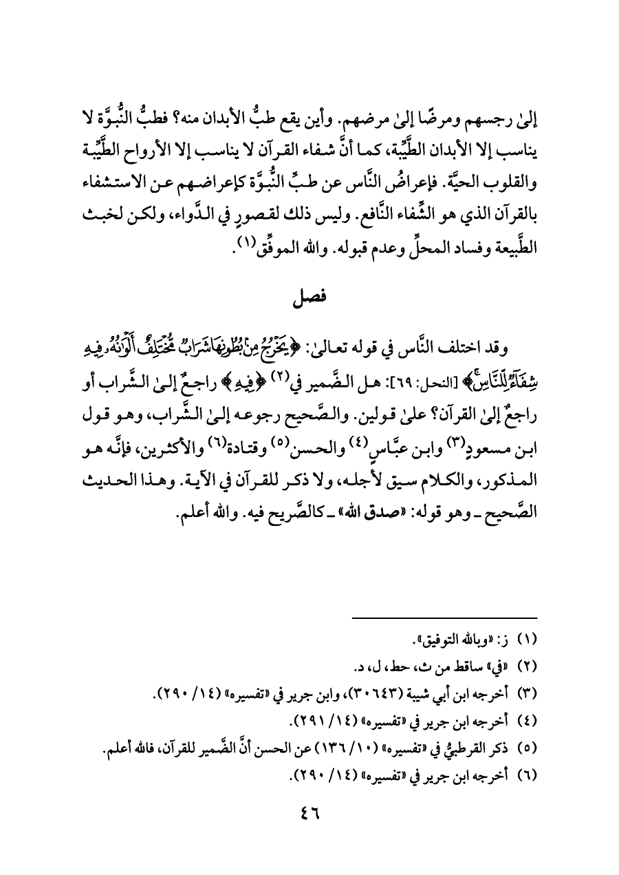 وقد اختلف النَّاس في قوله تعالى: {يَخْرُجُ مِنْ بُطُونِهَا شَرَابٌ مُخْتَلِفٌ أَلْوَانُهُ فِيهِ شِفَاءٌ لِلنَّاسِ} [النحل: ٦٩]: هل الضَّمير في (¬٢) {فِيهِ} راجعٌ إلى الشَّراب أو راجعٌ إلى القرآن؟ على قولين. والصَّحيح رجوعه إلى الشَّراب، وهو قول ابن مسعودٍ (¬٣) وابن عبَّاسٍ (¬٤) والحسن (¬٥) وقتادة (¬٦) والأكثرين، فإنَّه هو المذكور، والكلام سيق لأجله، ولا ذكر للقرآن في الآية. وهذا الحديث الصَّحيح ــ وهو قوله: «صدق الله» ــ كالصَّريح فيه. والله أعلم.