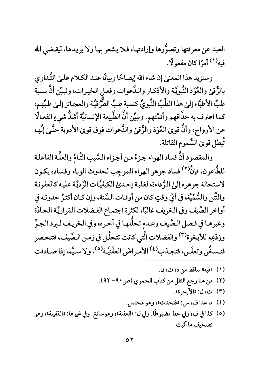 وسنزيد هذا المعنى إن شاء الله إيضاحًا وبيانًا عند الكلام على التَّداوي بالرُّقى والعُوَذ النَّبويَّة والأذكار والدَّعوات وفعل الخيرات، ونبيِّن أنَّ نسبة طبِّ الأطبَّاء إلى هذا الطِّبِّ النَّبويِّ كنسبة طبِّ الطُّرُقيَّة والعجائز إلى طبِّهم، كما اعترف به حذَّاقهم وأئمَّتهم. ونبيِّن أنَّ الطَّبيعة الإنسانيَّة أشدُّ شيءٍ انفعالًا عن الأرواح، وأنَّ قوى العُوَذ والرُّقى والدَّعوات فوق قوى الأدوية حتَّى إنَّها تُبطل قوى السُّموم القاتلة.