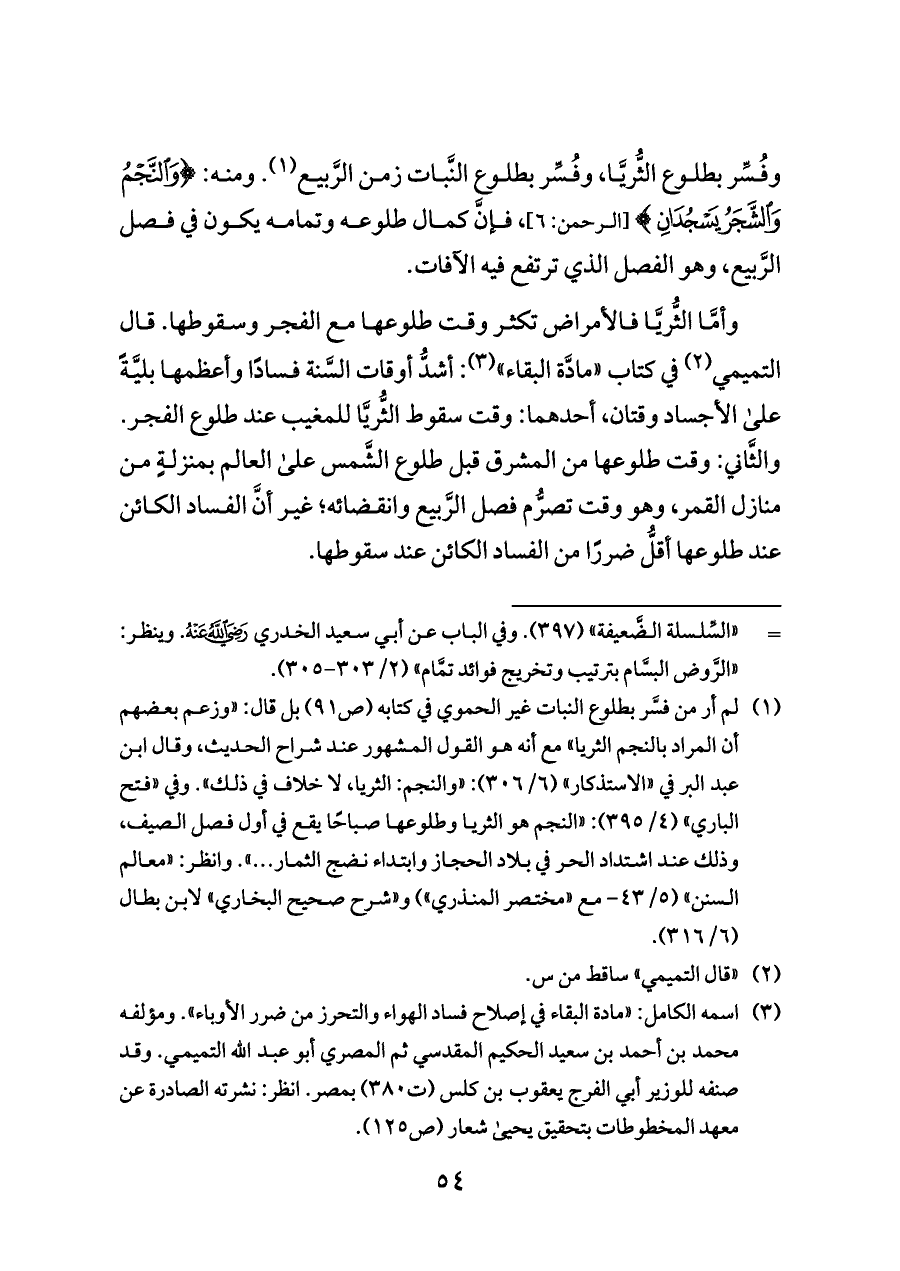 وفُسِّر بطلوع الثُّريَّا، وفُسِّر بطلوع النَّبات زمن الرَّبيع (¬١). ومنه: {وَالنَّجْمُ وَالشَّجَرُ يَسْجُدَانِ} [الرحمن: ٦]، فإنَّ كمال طلوعه وتمامه يكون في فصل الرَّبيع، وهو الفصل الذي ترتفع فيه الآفات.