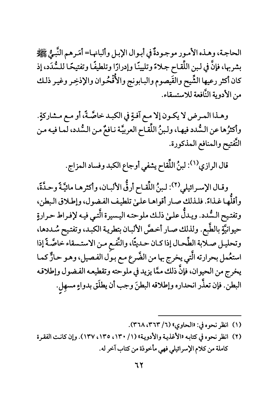 وقال الإسرائيلي (¬٢): لبنُ اللِّقاح أرقُّ الألبان، وأكثرها مائيَّةً وحدَّةً، وأقلُّها غذاءً. فلذلك صار أقواها على تلطيف الفضول، وإطلاق البطن، وتفتيح السُّدد. ويدلُّ على ذلك ملوحته اليسيرة الَّتي فيه لإفراط حرارةٍ حيوانيَّةٍ بالطَّبع. ولذلك صار أخصَّ الألبان بتطرية الكبد، وتفتيح سُددها، وتحليل صلابة الطِّحال إذا كان حديثًا، والنَّفعِ من الاستسقاء خاصَّةً إذا استعُمل بحرارته الَّتي يخرج بها من الضَّرع مع بول الفصيل، وهو حارٌّ كما يخرج من الحيوان، فإنَّ ذلك ممَّا يزيد في ملوحته وتقطيعه الفضول وإطلاقه البطن. فإن تعذَّر انحداره وإطلاقه البطنَ وجب أن يطلَق بدواءٍ مسهِلٍ.