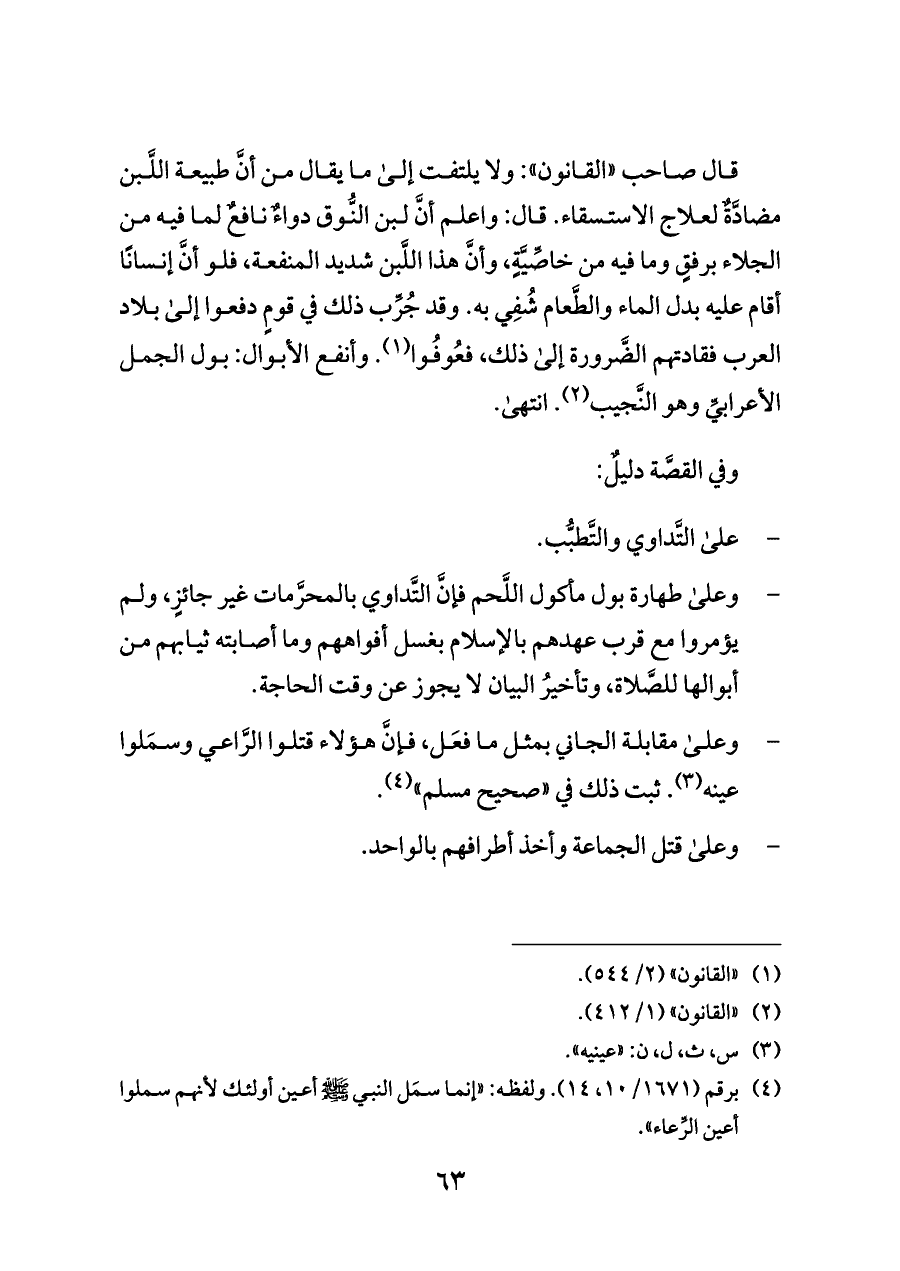 - وعلى طهارة بول مأكول اللَّحم فإنَّ التَّداوي بالمحرَّمات غير جائزٍ، ولم يؤمروا مع قرب عهدهم بالإسلام بغسل أفواههم وما أصابته ثيابهم من أبوالها للصَّلاة، وتأخيرُ البيان لا يجوز عن وقت الحاجة.
