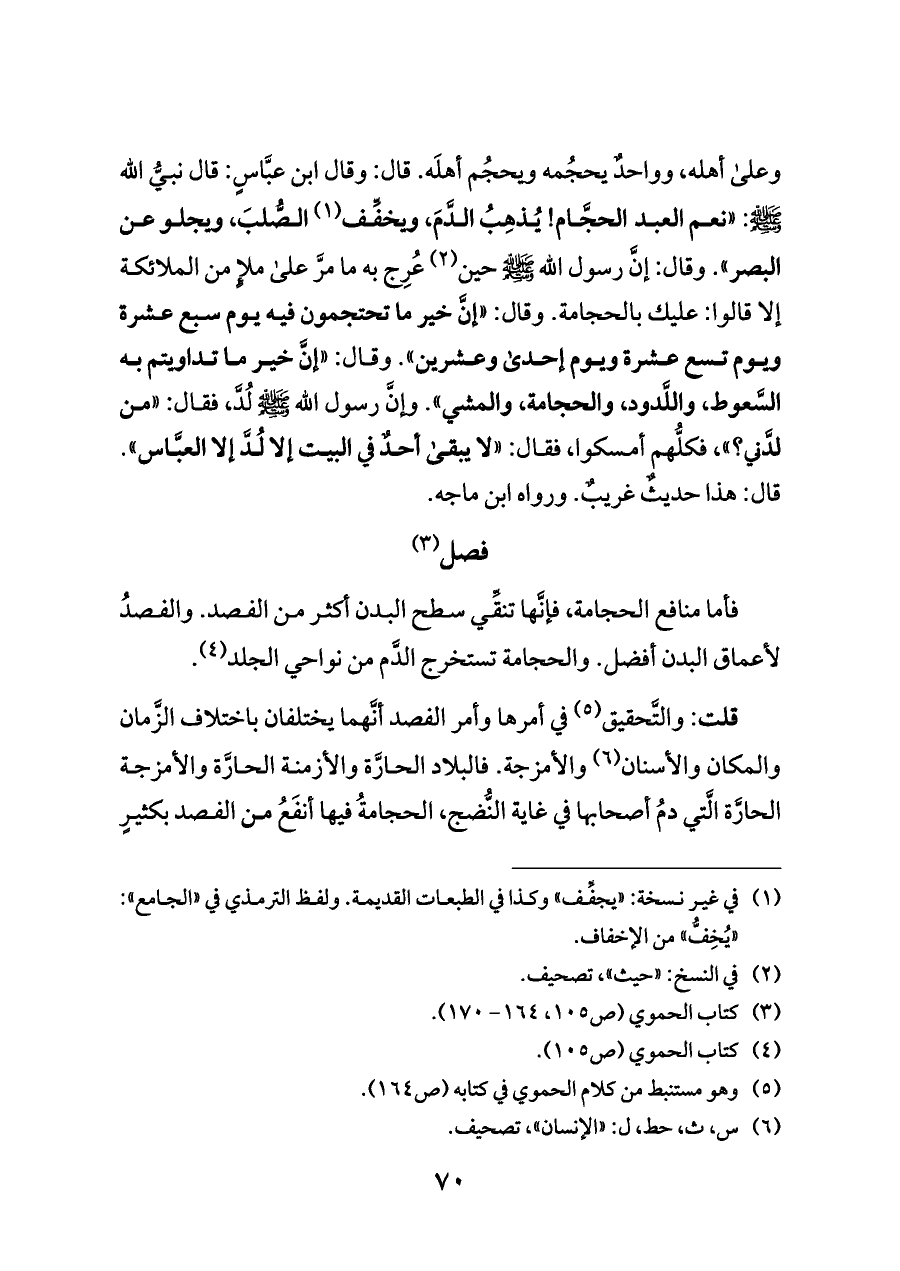 وعلى أهله، وواحدٌ يحجُمه ويحجُم أهلَه. قال: وقال ابن عبَّاسٍ: قال نبيُّ الله - صلى الله عليه وسلم -: «نعم العبد الحجَّام! يُذهِبُ الدَّمَ، ويخفِّف (¬١) الصُّلبَ، ويجلو عن البصر». وقال: إنَّ رسول الله - صلى الله عليه وسلم - حين (¬٢) عُرِج به ما مرَّ على ملإٍ من الملائكة إلا قالوا: عليك بالحجامة. وقال: «إنَّ خير ما تحتجمون فيه يوم سبع عشرة ويوم تسع عشرة ويوم إحدى وعشرين».