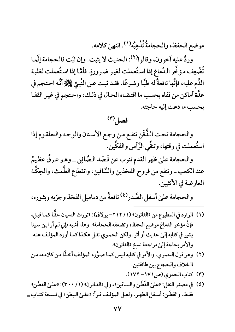 (¬١) الوارد في المطبوع من «القانون» (١/ ٢١٢ - بولاق): «تورث النسيان حقًّا كما قيل، فإنَّ مؤخر الدماغ موضع الحفظ، وتضعفه الحجامة». وهذا أشبه فإني لم أر ابن سينا يشير في كتابه إلى حديث أو أثر. ولكن الحموي نقل هكذا كما أورد المؤلف عنه. والأمر بحاجة إلى مراجعة نسخ «القانون».