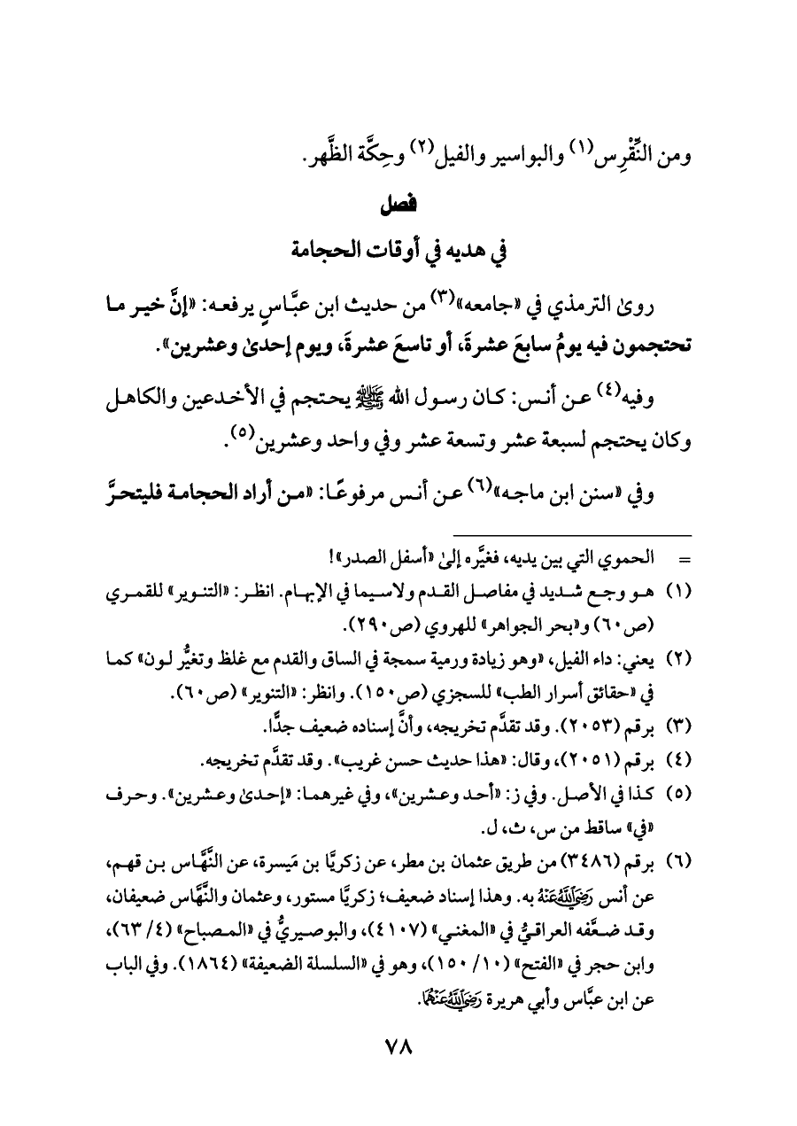 وفيه (¬٤) عن أنس: كان رسول الله - صلى الله عليه وسلم - يحتجم في الأخدعين والكاهل وكان يحتجم لسبعة عشر وتسعة عشر وفي واحد وعشرين (¬٥).
