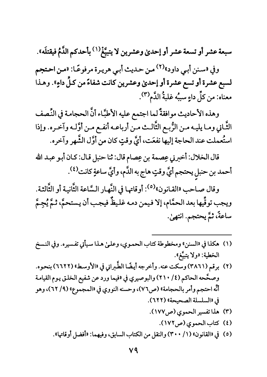 وفي «سنن أبي داود» (¬٢) من حديث أبي هريرة مرفوعًا: «من احتجم لسبع عشرة أو تسع عشرة أو إحدى وعشرين كانت شفاءً من كلِّ داءٍ». وهذا معناه: من كلِّ داءٍ سببُه غلبةُ الدَّم (¬٣).