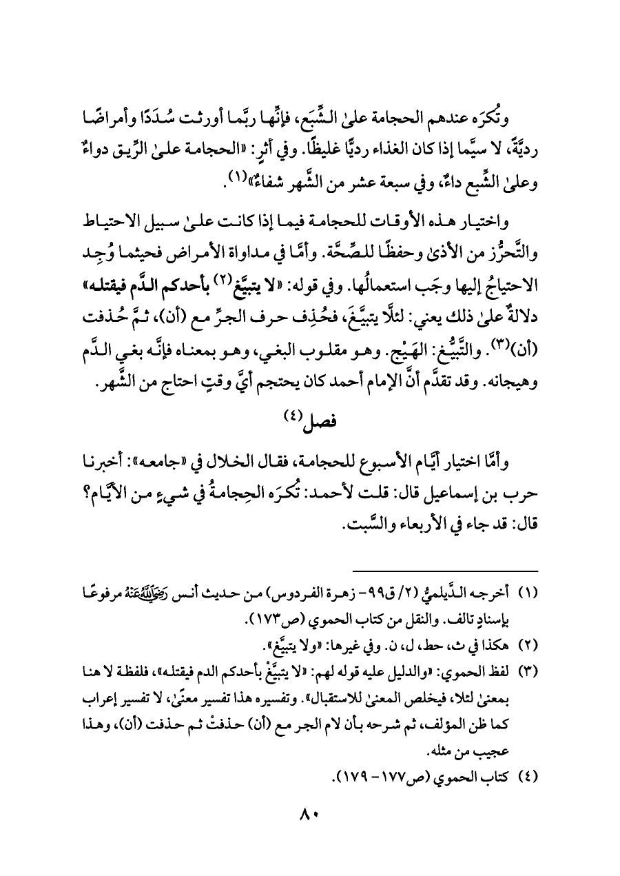 واختيار هذه الأوقات للحجامة فيما إذا كانت على سبيل الاحتياط والتَّحرُّز من الأذى وحفظًا للصِّحَّة. وأمَّا في مداواة الأمراض فحيثما وُجِد الاحتياجُ إليها وجَب استعمالُها. وفي قوله: «لا يتبيَّغ (¬٢) بأحدكم الدَّم فيقتله» دلالةٌ على ذلك يعني: لئلَّا يتبيَّغَ، فحُذِف حرف الجرِّ مع (أن)، ثمَّ حُذفت (أن) (¬٣). والتَّبيُّغ: الهَيْج. وهو مقلوب البغي، وهو بمعناه فإنَّه بغي الدَّم وهيجانه. وقد تقدَّم أنَّ الإمام أحمد كان يحتجم أيَّ وقتٍ احتاج من الشَّهر.