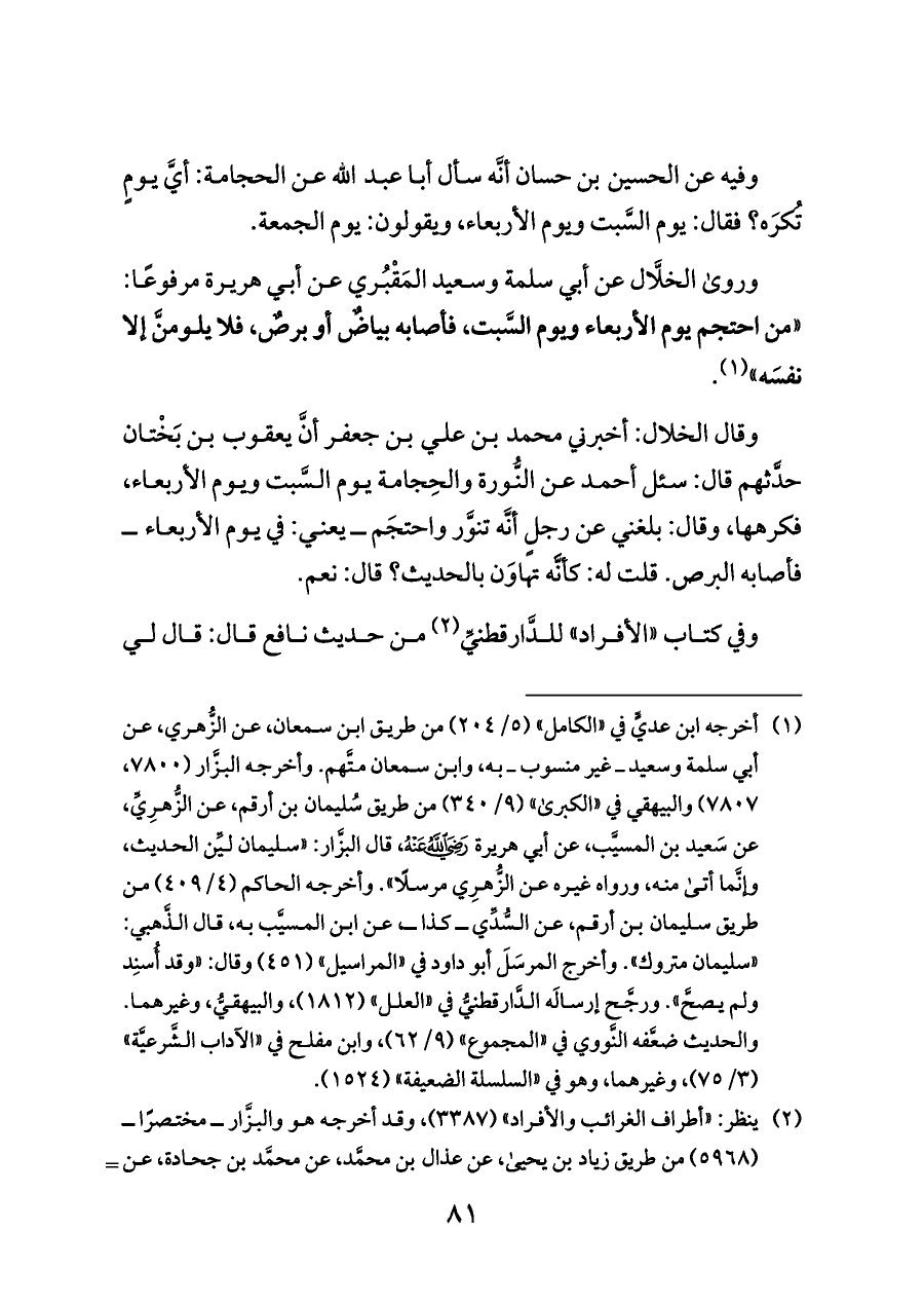 وقال الخلال: أخبرني محمد بن علي بن جعفر أنَّ يعقوب بن بَخْتان حدَّثهم قال: سئل أحمد عن النُّورة والحِجامة يوم السَّبت ويوم الأربعاء، فكرهها، وقال: بلغني عن رجلٍ أنَّه تنوَّر واحتجَم ــ يعني: في يوم الأربعاء ــ فأصابه البرص. قلت له: كأنَّه تهاوَن بالحديث؟ قال: نعم.