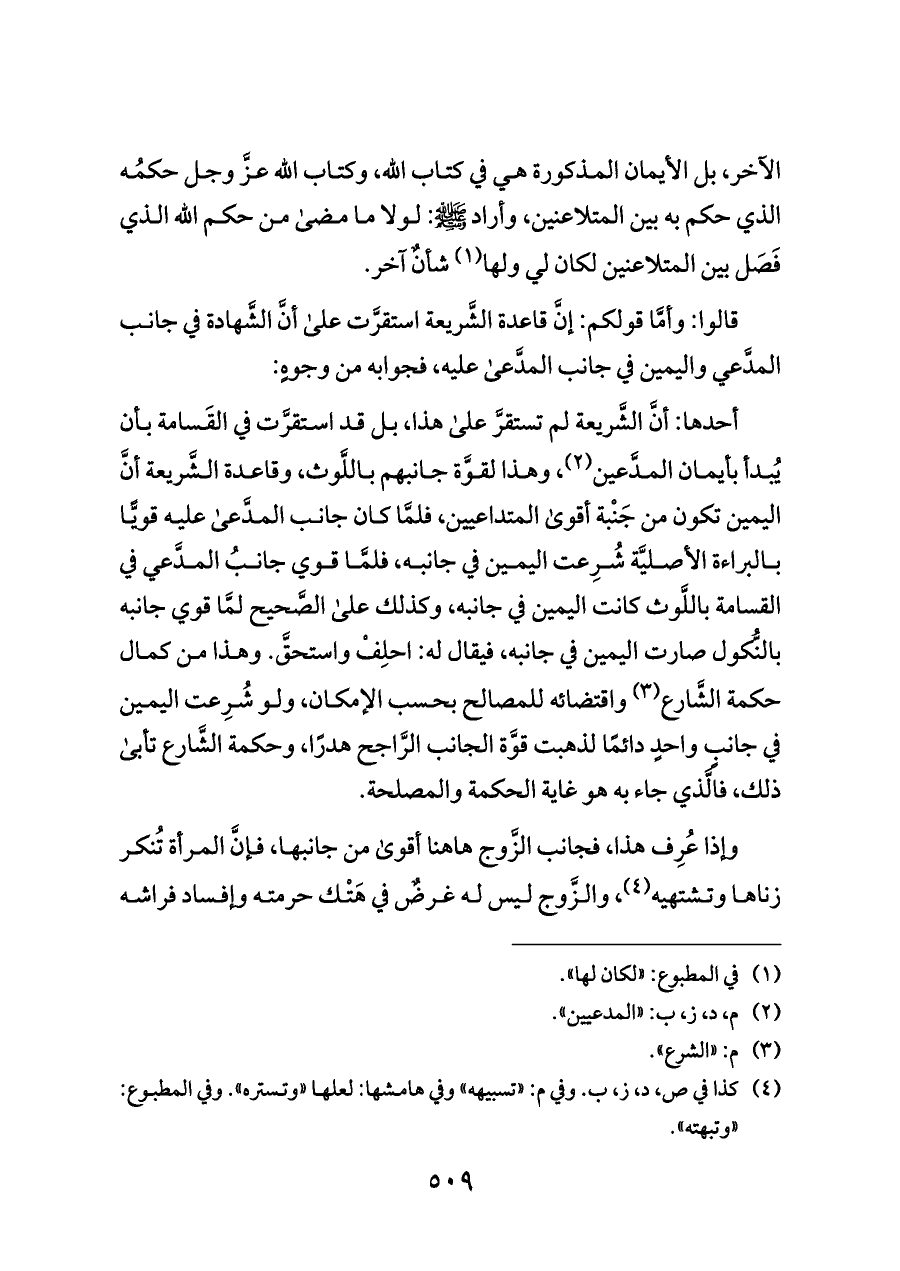 قالوا: وأمَّا قولكم: إنَّ قاعدة الشَّريعة استقرَّت على أنَّ الشَّهادة في جانب المدَّعي واليمين في جانب المدَّعى عليه، فجوابه من وجوهٍ: