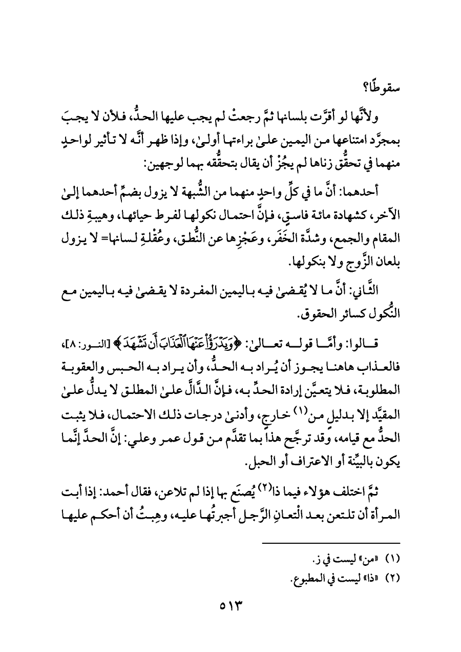 قالوا: وأمَّا قوله تعالى: {(٧) وَيَدْرَأُ عَنْهَا الْعَذَابَ أَنْ} [النور: ٨]، فالعذاب هاهنا يجوز أن يُراد به الحدُّ، وأن يراد به الحبس والعقوبة المطلوبة، فلا يتعيَّن إرادة الحدِّ به، فإنَّ الدَّالَّ على المطلق لا يدلُّ على المقيَّد إلا بدليلٍ من (¬١) خارجٍ، وأدنى درجات ذلك الاحتمال، فلا يثبت الحدُّ مع قيامه، وقد ترجَّح هذا بما تقدَّم من قول عمر وعلي: إنَّ الحدَّ إنَّما يكون بالبيِّنة أو الاعتراف أو الحبل.