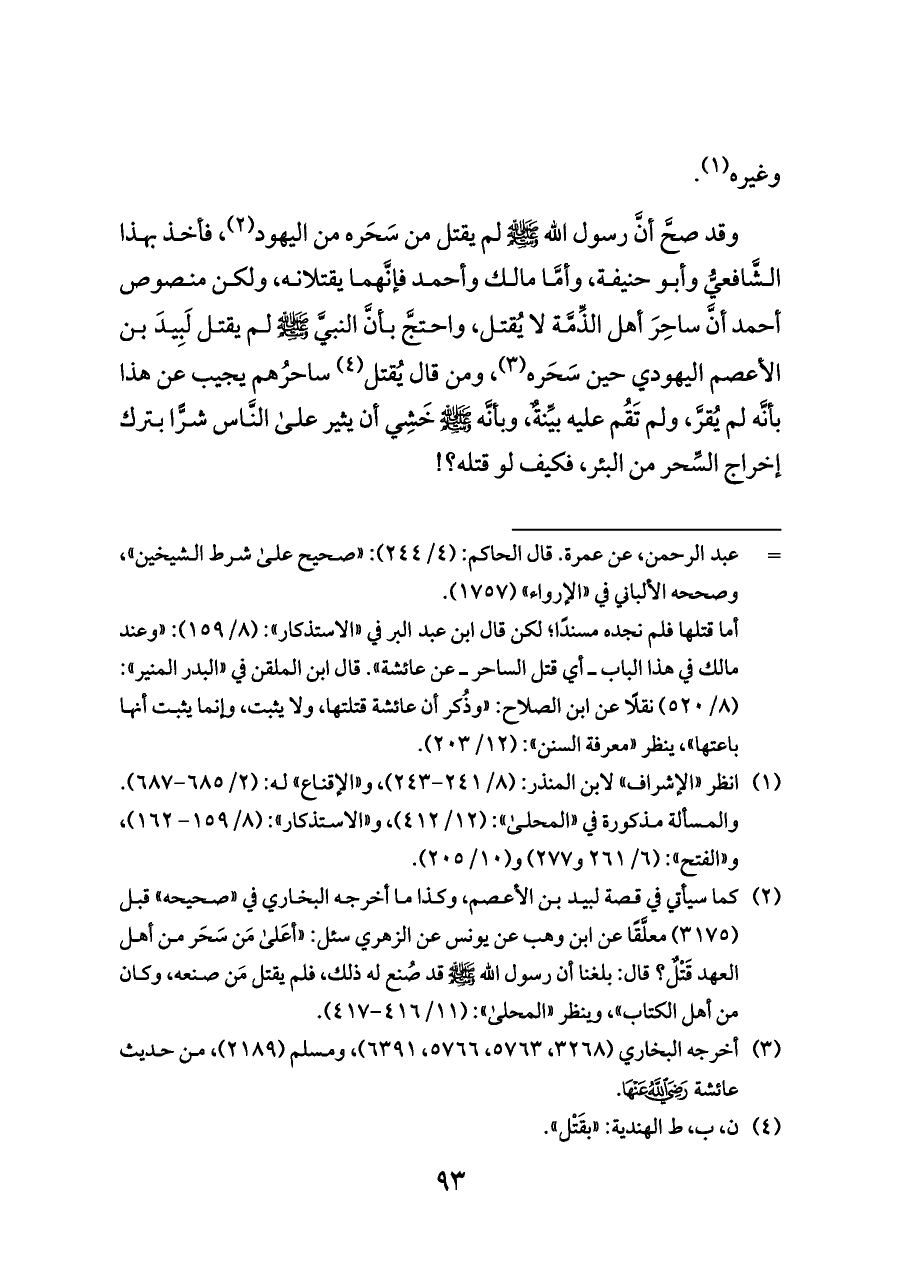 (¬٢) كما سيأتي في قصة لبيد بن الأعصم، وكذا ما أخرجه البخاري في «صحيحه» قبل (٣١٧٥) معلَّقًا عن ابن وهب عن يونس عن الزهري سئل: «أعَلى مَن سَحَر من أهل العهد قَتْلٌ؟ قال: بلغنا أن رسول الله - صلى الله عليه وسلم - قد صُنع له ذلك، فلم يقتل مَن صنعه، وكان من أهل الكتاب»، وينظر «المحلى»: (١١/ ٤١٦ - ٤١٧).