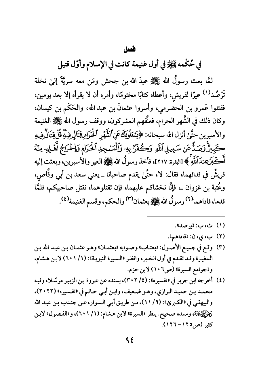 لمَّا بعث رسولُ الله - صلى الله عليه وسلم - عبدَ الله بن جحش ومَن معه سريَّةً إلى نخلة تَرْصُد (¬١) عيرًا لقريشٍ، وأعطاه كتابًا مختومًا، وأمره أن لا يقرأه إلا بعد يومين، فقتلوا عَمرو بن الحضرمي، وأسروا عثمانَ بن عبد الله، والحَكَم بن كيسان، وكان ذلك في الشَّهر الحرام، فعنَّفهم المشركون، ووقف رسول الله - صلى الله عليه وسلم - الغنيمة والأسيرين حتَّى أنزل الله سبحانه: {يَسْأَلُونَكَ عَنِ الشَّهْرِ الْحَرَامِ قِتَالٍ فِيهِ قُلْ قِتَالٌ فِيهِ كَبِيرٌ وَصَدٌّ عَنْ سَبِيلِ اللَّهِ وَكُفْرٌ بِهِ وَالْمَسْجِدِ الْحَرَامِ وَإِخْرَاجُ أَهْلِهِ مِنْهُ أَكْبَرُ عِنْدَ اللَّهِ} [البقرة: ٢١٧]، فأخذ رسولُ الله - صلى الله عليه وسلم - العير والأسيرين، وبعثت إليه قريشٌ في فدائهما، فقال: لا، حتَّى يقدم صاحبانا ــ يعني سعد بن أبي وقَّاصٍ، وعُتبة بن غزوان ــ، فإنَّا نخشاكم عليهما، فإن تقتلوهما، نقتل صاحبيكم، فلمَّا قدما، فاداهما (¬٢) رسولُ الله - صلى الله عليه وسلم - بعثمان (¬٣) والحكم، وقسم الغنيمة (¬٤).