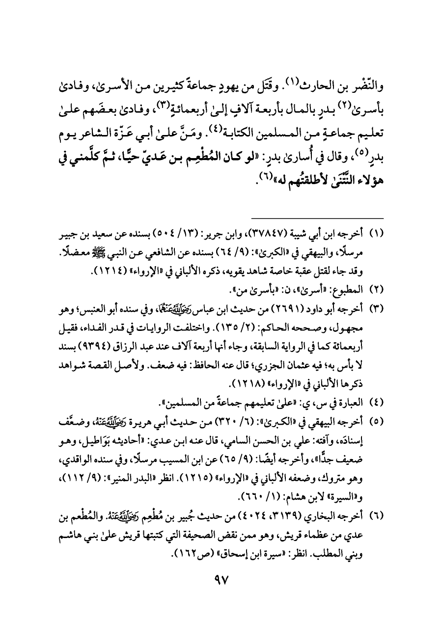 (¬٦) أخرجه البخاري (٣١٣٩، ٤٠٢٤) من حديث جُبير بن مُطْعِم - رضي الله عنه - . والمُطْعم بن عدي من عظماء قريش، وهو ممن نقض الصحيفة التي كتبتها قريش على بني هاشم وبني المطلب. انظر: «سيرة ابن إسحاق» (ص ١٦٢).