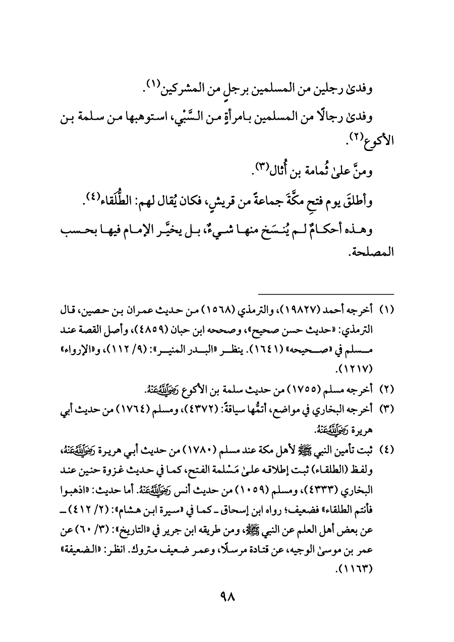 (¬٤) ثبت تأمين النبي - صلى الله عليه وسلم - لأهل مكة عند مسلم (١٧٨٠) من حديث أبي هريرة - رضي الله عنه - ، ولفظ (الطلقاء) ثبت إطلاقه على مَسْلمة الفتح، كما في حديث غزوة حنين عند البخاري (٤٣٣٣)، ومسلم (١٠٥٩) من حديث أنس - رضي الله عنه - . أما حديث: «اذهبوا فأنتم الطلقاء» فضعيف؛ رواه ابن إسحاق ــ كما في «سيرة ابن هشام»: (٢/ ٤١٢) ــ عن بعض أهل العلم عن النبي - صلى الله عليه وسلم -، ومن طريقه ابن جرير في «التاريخ»: (٣/ ٦٠) عن عمر بن موسى الوجيه، عن قتادة مرسلًا، وعمر ضعيف متروك. انظر: «الضعيفة» (١١٦٣).