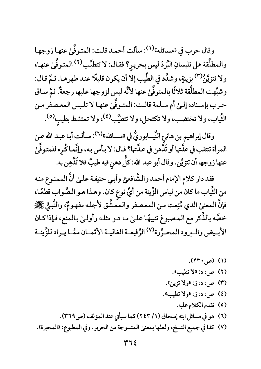 وقال إبراهيم بن هانئٍ النَّيسابوريُّ في «مسائله» (¬٦): سألت أبا عبد الله عن المرأة تنتقب في عدَّتها أو تَدَّهن في عدَّتها؟ قال: لا بأس به، وإنَّما كُرِه للمتوفَّى عنها زوجها أن تتزيَّن. وقال أبو عبد الله: كلُّ دهنٍ فيه طيبٌ فلا تَدَّهِن به.