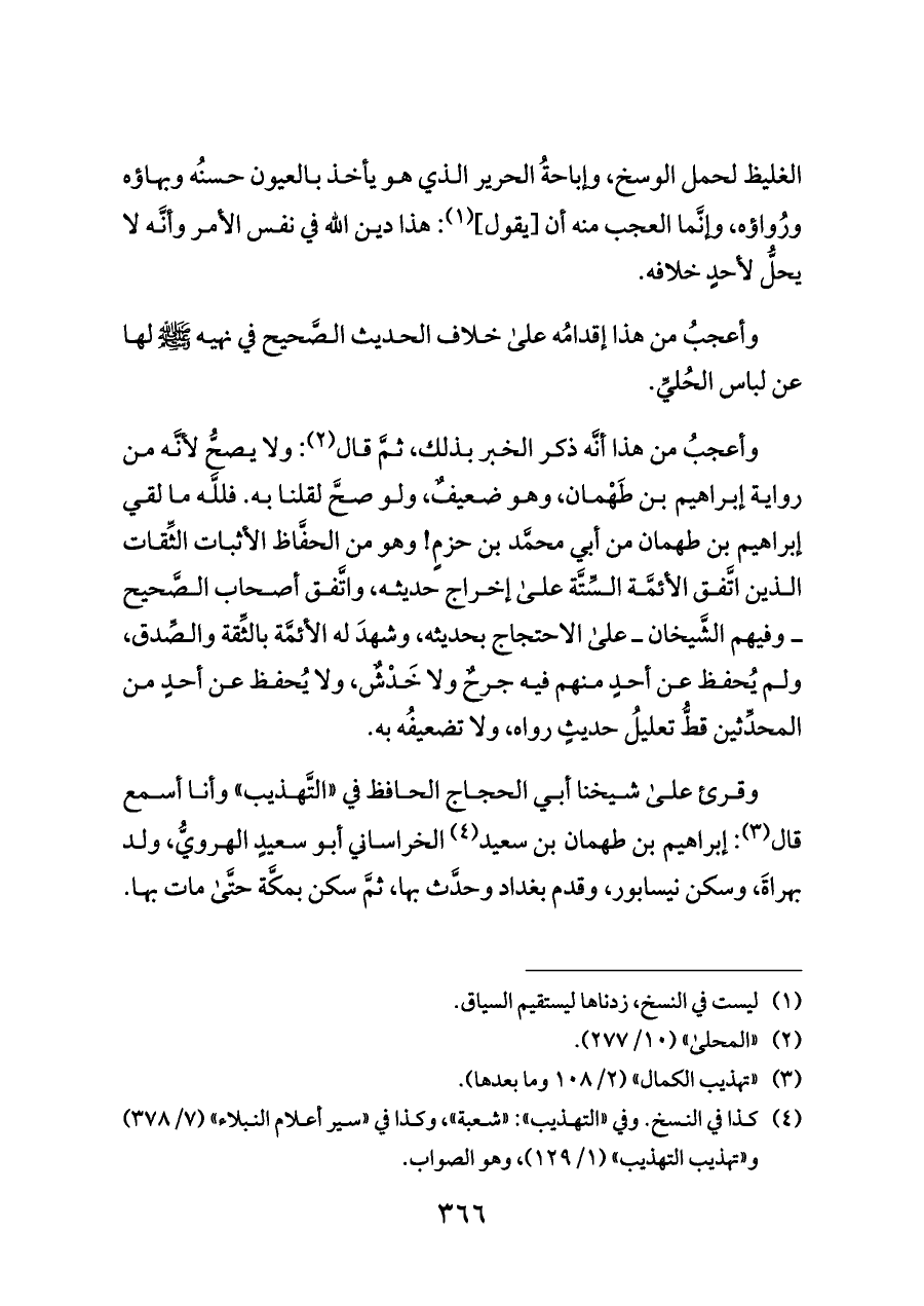 وأعجبُ من هذا أنَّه ذكر الخبر بذلك، ثمَّ قال (¬٢): ولا يصحُّ لأنَّه من رواية إبراهيم بن طَهْمان، وهو ضعيفٌ، ولو صحَّ لقلنا به. فللَّه ما لقي إبراهيم بن طهمان من أبي محمَّد بن حزمٍ! وهو من الحفَّاظ الأثبات الثِّقات الذين اتَّفق الأئمَّة السِّتَّة على إخراج حديثه، واتَّفق أصحاب الصَّحيح ــ وفيهم الشَّيخان ــ على الاحتجاج بحديثه، وشهدَ له الأئمَّة بالثِّقة والصِّدق، ولم يُحفظ عن أحدٍ منهم فيه جرحٌ ولا خَدْشٌ، ولا يُحفظ عن أحدٍ من المحدِّثين قطُّ تعليلُ حديثٍ رواه، ولا تضعيفُه به.
