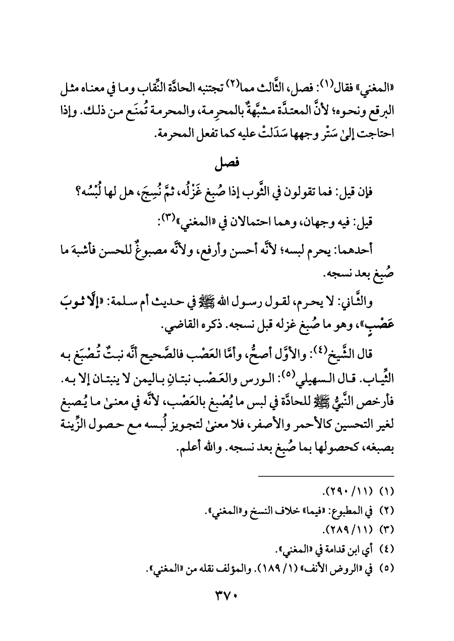 قال الشَّيخ (¬٤): والأوَّل أصحُّ، وأمَّا العَصْب فالصَّحيح أنَّه نبتٌ تُصْبَغ به الثِّياب. قال السهيلي (¬٥): الورس والعَصْب نبتانِ باليمن لا ينبتان إلا به. فأرخص النَّبيُّ - صلى الله عليه وسلم - للحادَّة في لبس ما يُصْبغ بالعَصْب، لأنَّه في معنى ما يُصبغ لغير التحسين كالأحمر والأصفر، فلا معنى لتجويز لُبسه مع حصول الزِّينة بصبغه، كحصولها بما صُبِغ بعد نسجه. والله أعلم.