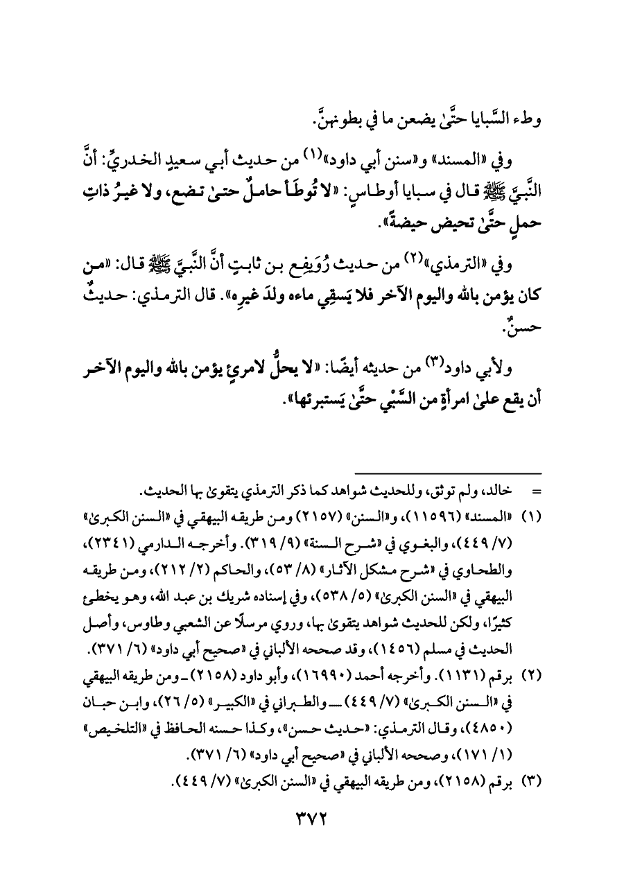 ولأبي داود (¬٣) من حديثه أيضًا: «لا يحلُّ لامرئٍ يؤمن بالله واليوم الآخر أن يقع على امرأةٍ من السَّبْي حتَّى يَستبرئها».