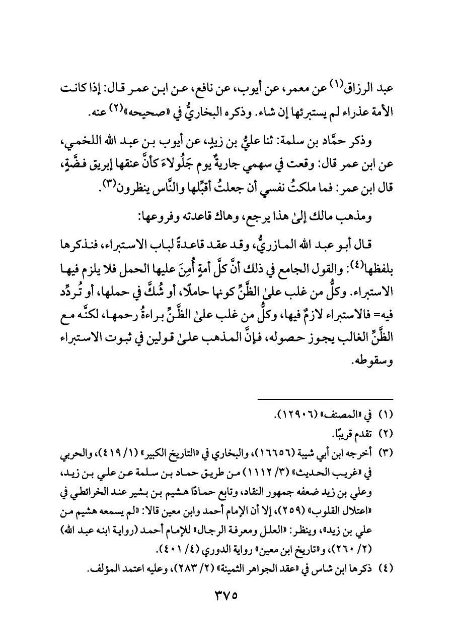 قال أبو عبد الله المازريُّ، وقد عقد قاعدةً لباب الاستبراء، فنذكرها بلفظها (¬٤): والقول الجامع في ذلك أنَّ كلَّ أمةٍ أُمِنَ عليها الحمل فلا يلزم فيها الاستبراء. وكلُّ من غلب على الظَّنِّ كونها حاملًا، أو شُكَّ في حملها، أو تُردِّد فيه= فالاستبراء لازمٌ فيها، وكلُّ من غلب على الظَّنِّ براءةُ رحمها، لكنَّه مع الظَّنِّ الغالب يجوز حصوله، فإنَّ المذهب على قولين في ثبوت الاستبراء وسقوطه.