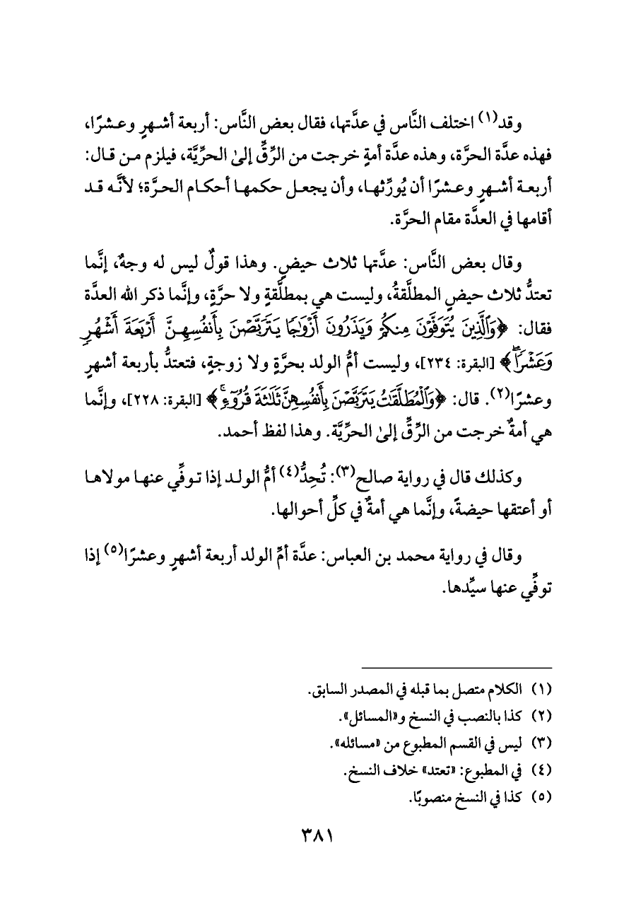 وقال بعض النَّاس: عدَّتها ثلاث حيضٍ. وهذا قولٌ ليس له وجهٌ، إنَّما تعتدُّ ثلاث حيضٍ المطلَّقةُ، وليست هي بمطلَّقةٍ ولا حرَّةٍ، وإنَّما ذكر الله العدَّة فقال: {وَالَّذِينَ يُتَوَفَّوْنَ مِنْكُمْ وَيَذَرُونَ أَزْوَاجًا يَتَرَبَّصْنَ بِأَنْفُسِهِنَّ أَرْبَعَةَ أَشْهُرٍ وَعَشْرًا} [البقرة: ٢٣٤]، وليست أمُّ الولد بحرَّةٍ ولا زوجةٍ، فتعتدُّ بأربعة أشهرٍ وعشرًا (¬٢). قال: {وَالْمُطَلَّقَاتُ يَتَرَبَّصْنَ بِأَنْفُسِهِنَّ ثَلَاثَةَ قُرُوءٍ} [البقرة: ٢٢٨]، وإنَّما هي أمةٌ خرجت من الرِّقِّ إلى الحرِّيَّة. وهذا لفظ أحمد.