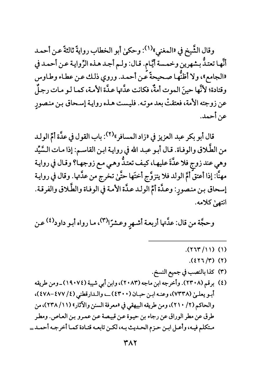 قال أبو بكر عبد العزيز في «زاد المسافر» (¬٢): باب القول في عدَّة أمِّ الولد من الطَّلاق والوفاة. قال أبو عبد الله في رواية ابن القاسم: إذا مات السَّيِّد وهي عند زوجٍ فلا عدَّةَ عليها، كيف تعتدُّ وهي مع زوجها؟ وقال في رواية مهنَّا: إذا أعتق أمَّ الولد فلا يتزوَّج أختَها حتَّى تخرج من عدَّتها. وقال في رواية إسحاق بن منصورٍ: وعدَّة أمِّ الولد عدَّة الأمة في الوفاة والطَّلاق والفرقة. انتهى كلامه.