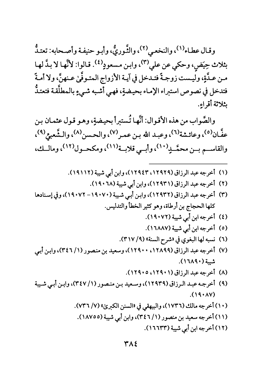 والصَّواب من هذه الأقوال: أنَّها تُستبرأ بحيضةٍ، وهو قول عثمان بن عفَّان (¬٥)، وعائشة (¬٦)، وعبد الله بن عمر (¬٧)، والحسن (¬٨)، والشَّعبيِّ (¬٩)، والقاسم بن محمَّدٍ (¬١٠)، وأبي قلابة (¬١١)، ومكحول (¬١٢)، ومالك،