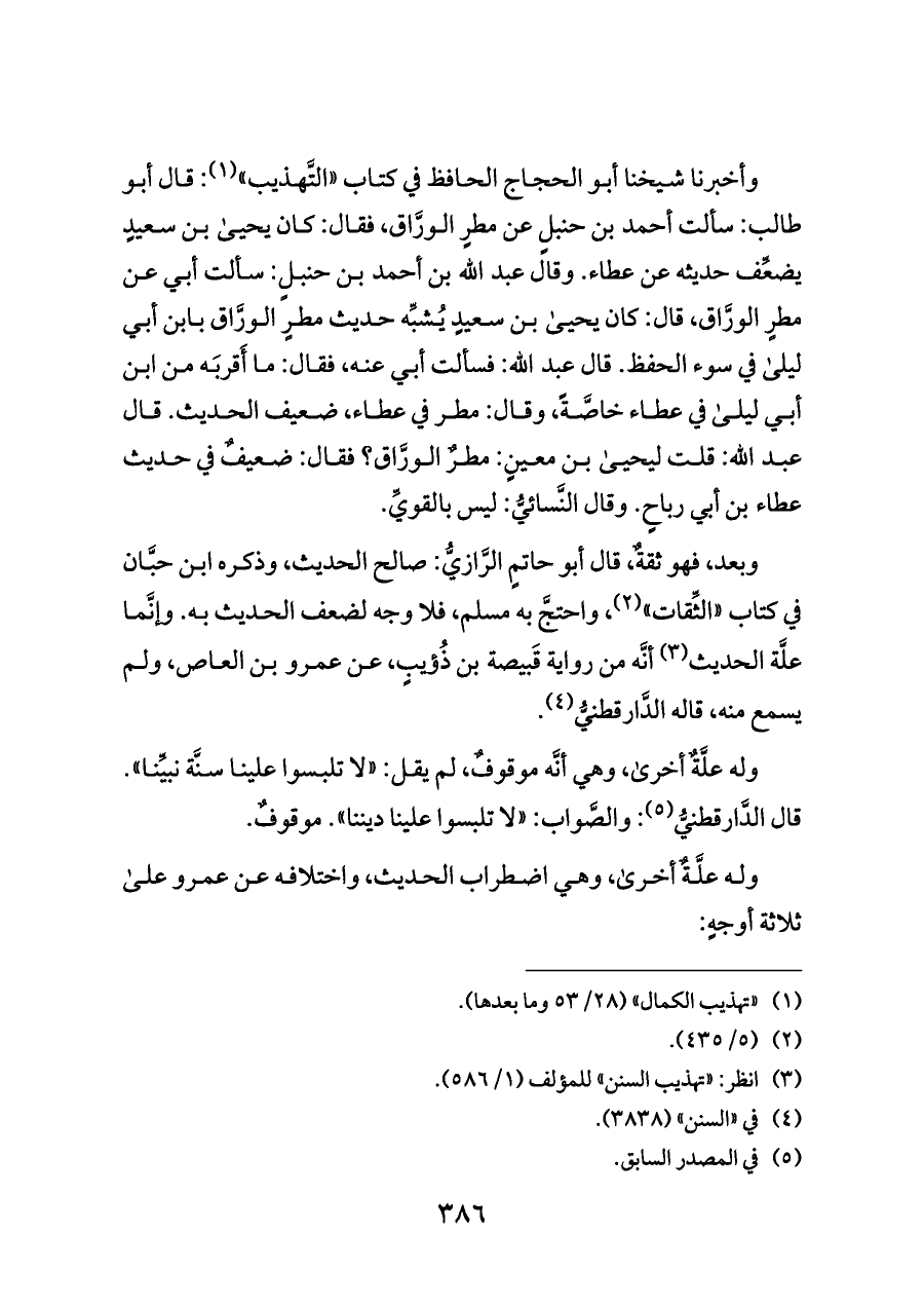 وأخبرنا شيخنا أبو الحجاج الحافظ في كتاب «التَّهذيب» (¬١): قال أبو طالب: سألت أحمد بن حنبلٍ عن مطرٍ الورَّاق، فقال: كان يحيى بن سعيدٍ يضعِّف حديثه عن عطاء. وقال عبد الله بن أحمد بن حنبلٍ: سألت أبي عن مطرٍ الورَّاق، قال: كان يحيى بن سعيدٍ يُشبِّه حديث مطرٍ الورَّاق بابن أبي ليلى في سوء الحفظ. قال عبد الله: فسألت أبي عنه، فقال: ما أَقربَه من ابن أبي ليلى في عطاء خاصَّةً، وقال: مطر في عطاء، ضعيف الحديث. قال عبد الله: قلت ليحيى بن معينٍ: مطرٌ الورَّاق؟ فقال: ضعيفٌ في حديث عطاء بن أبي رباحٍ. وقال النَّسائيُّ: ليس بالقويِّ.
