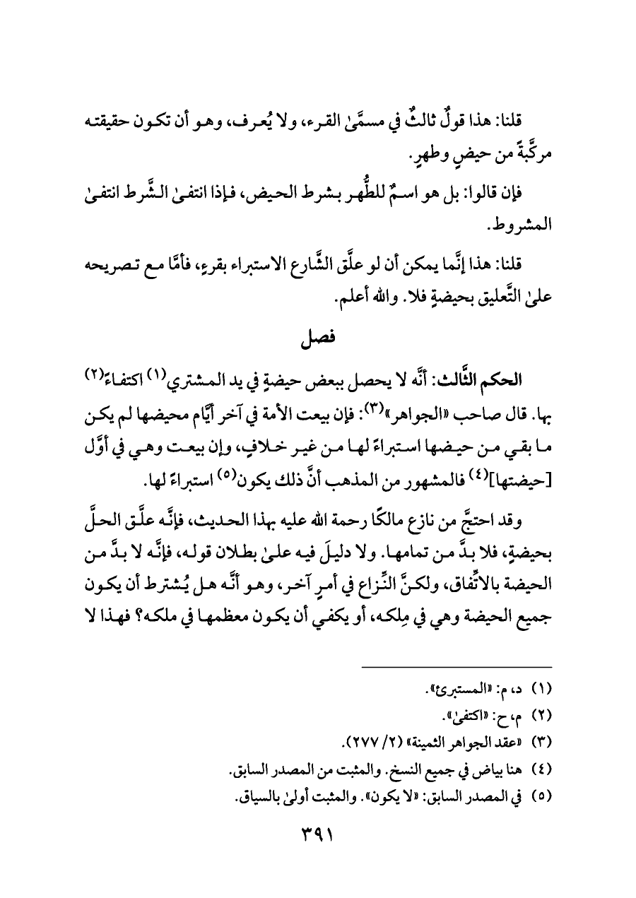 الحكم الثَّالث: أنَّه لا يحصل ببعض حيضةٍ في يد المشتري (¬١) اكتفاءً (¬٢) بها. قال صاحب «الجواهر» (¬٣): فإن بيعت الأمة في آخر أيَّام محيضها لم يكن ما بقي من حيضها استبراءً لها من غير خلافٍ، وإن بيعت وهي في أوَّل [حيضتها] (¬٤) فالمشهور من المذهب أنَّ ذلك يكون (¬٥) استبراءً لها.