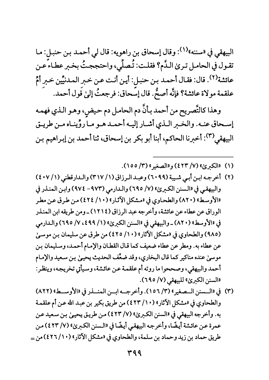 البيهقي في «سننه» (¬١): وقال إسحاق بن راهويه: قال لي أحمد بن حنبلٍ: ما تقول في الحامل ترى الدَّم؟ فقلت: تُصلِّي، واحتججتُ بخبر عطاء عن عائشة (¬٢). قال: فقال أحمد بن حنبلٍ: أين أنت عن خبرِ المدنيِّين خبرِ أمِّ علقمة مولاة عائشة؟ فإنَّه أصحُّ. قال إسحاق: فرجعتُ إلى قول أحمد.